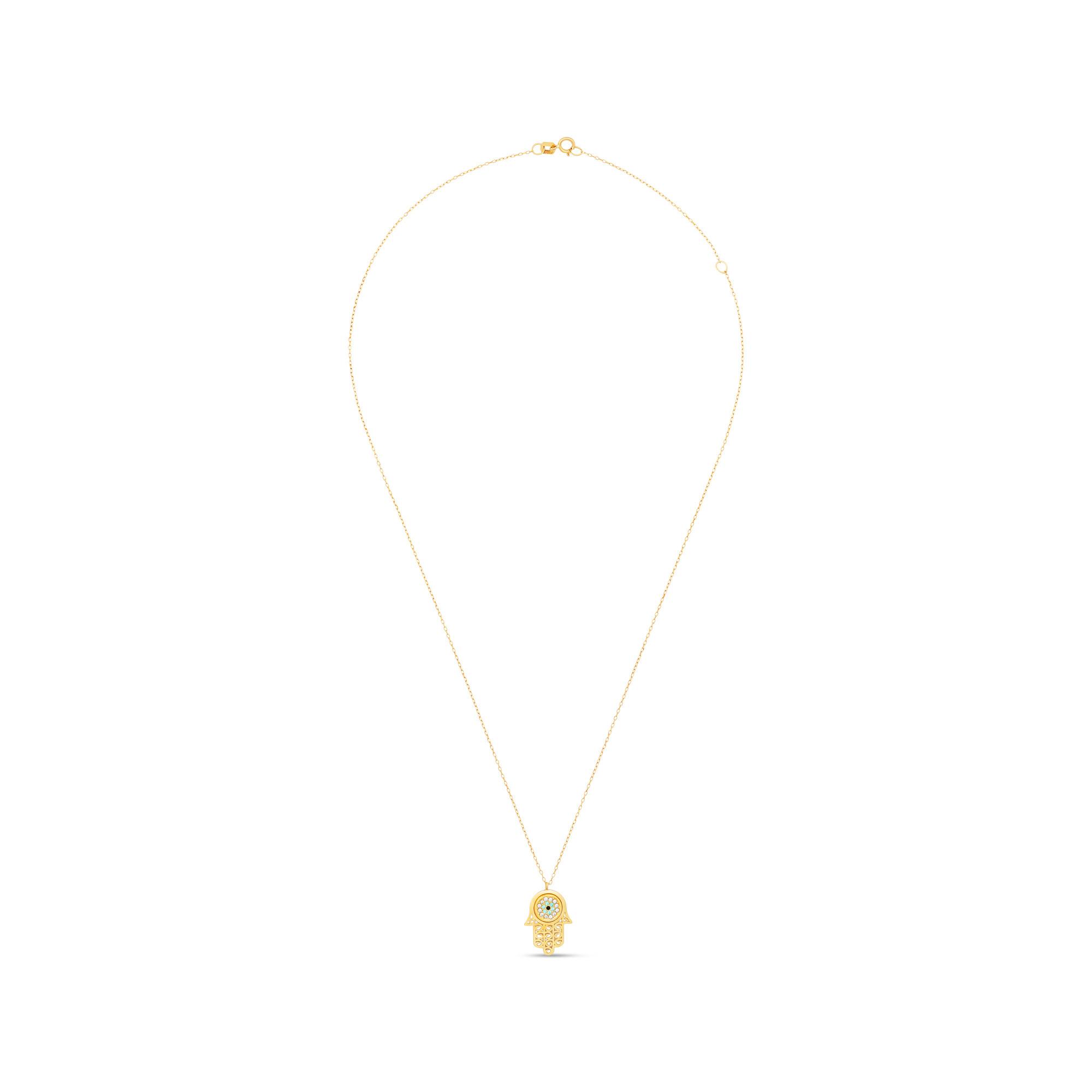 Diese Halskette von L’Atelier Gold 18 Karat by Manor ist ein filigranes Kleinod mit zeitlosem Design und orientalischem Charme. Die Kette trägt einen zierlichen Hand-der-Fatima-Anhänger, ist weitenverstellbar und lässt sich stilvoll per Federringverschluss schliessen.