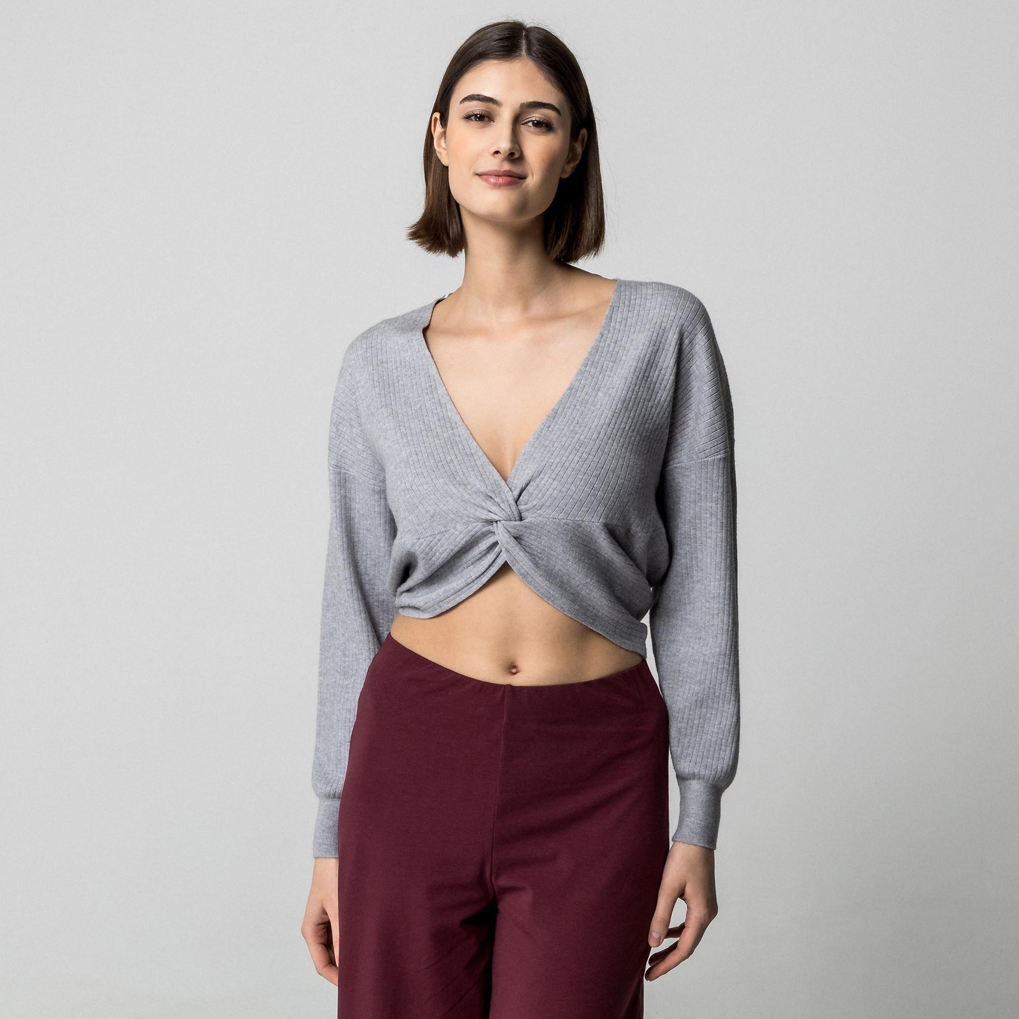 Dieses Pyjama-Oberteil verfügt über einen stilvollen V-Ausschnitt und ein gedrehtes Detail auf der Vorderseite, das einen modernen und bequemen Look schafft. Die langen Ärmel sind mit gerippten Bündchen versehen, die für einen guten Sitz sorgen. Die gerippte Textur des Stoffes verleiht diesem Loungewear-Essential einen Hauch von Raffinesse.