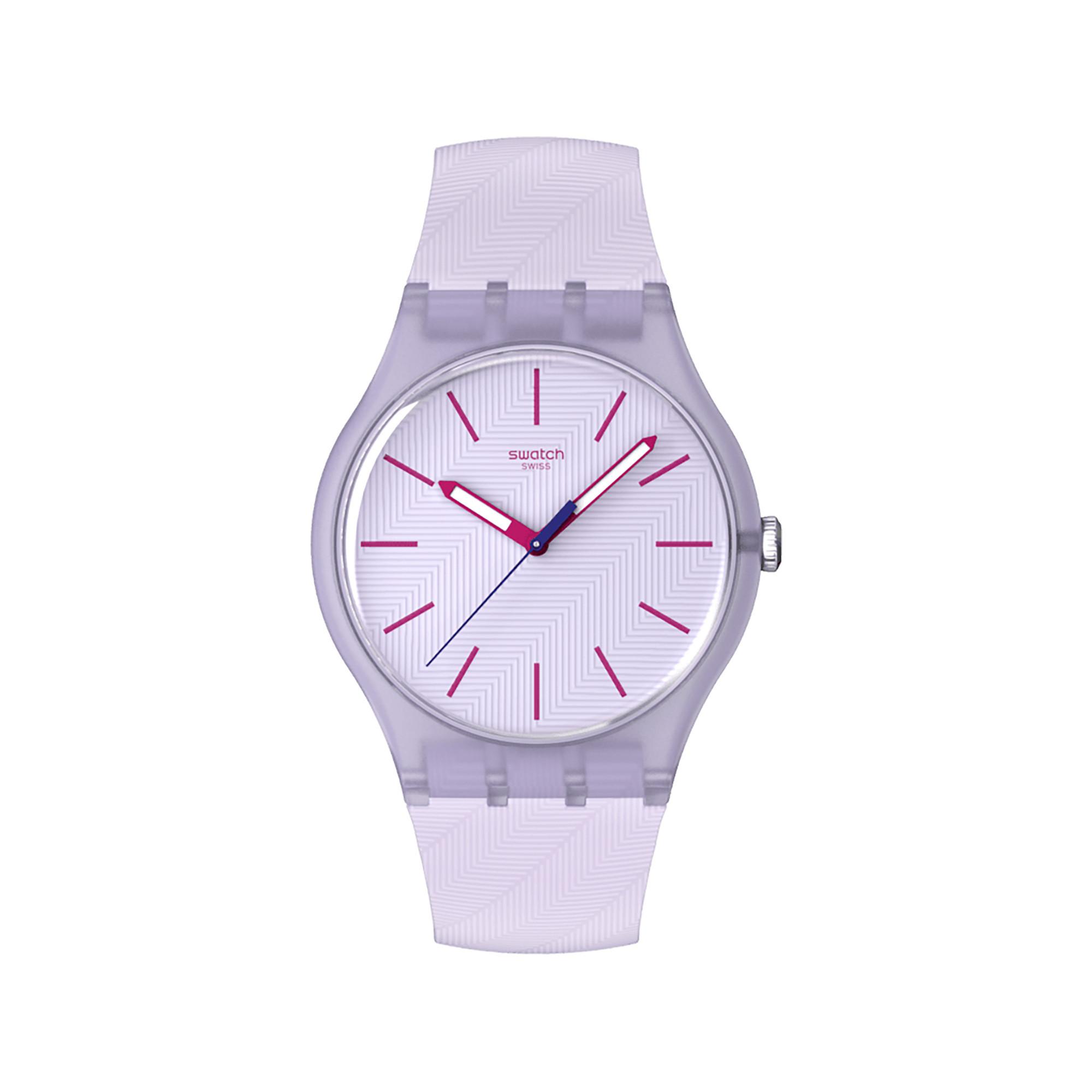 Die Uhr überzeugt mit einem strukturierten hellvioletten Zifferblatt, dunkelrosa Stundenmarkierungen und fluoreszierenden Zeigern unter biobasiertem Glas. Das matte hellviolette Gehäuse mit passendem Armband und transparenter Schliesse verleiht ihr einen stilvollen, modernen Look.