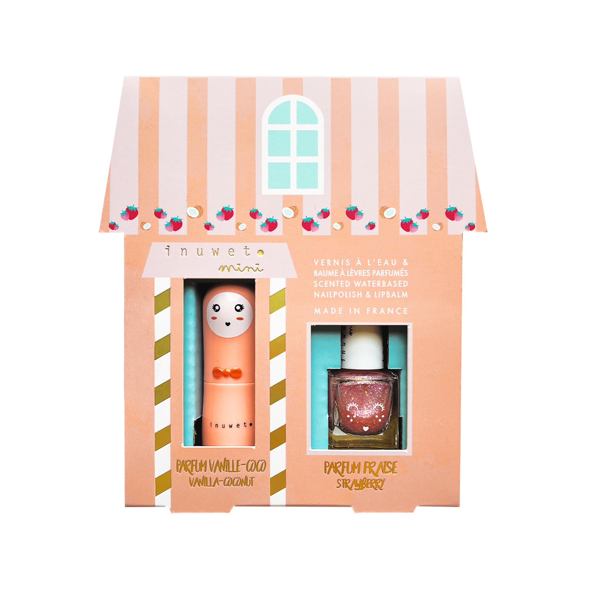 Besteht aus einem pflegenden Lippenbalsam mit Vanille-Kokos-Duft, begleitet von seinem Wasserlack für Kinder mit Erdbeerduft.
