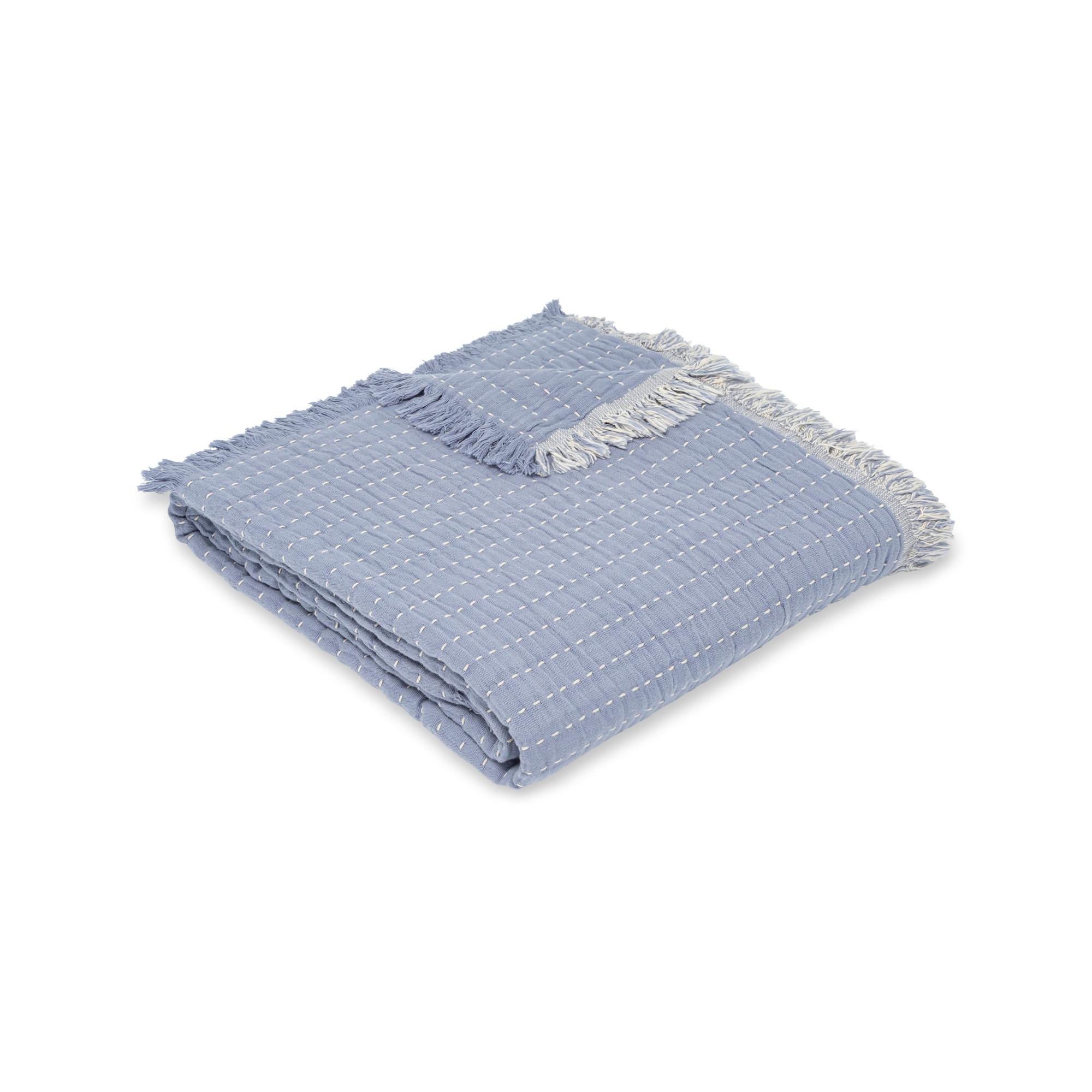 Dieses Plaid von Manor wirkt schlicht und natürlich mit der Stickerei im Sashiko-Stil, die traditionell mit hellem Garn auf dunklen Stoff genäht wurde. Das Design unterstreichen weiche, mittellange Fransen.