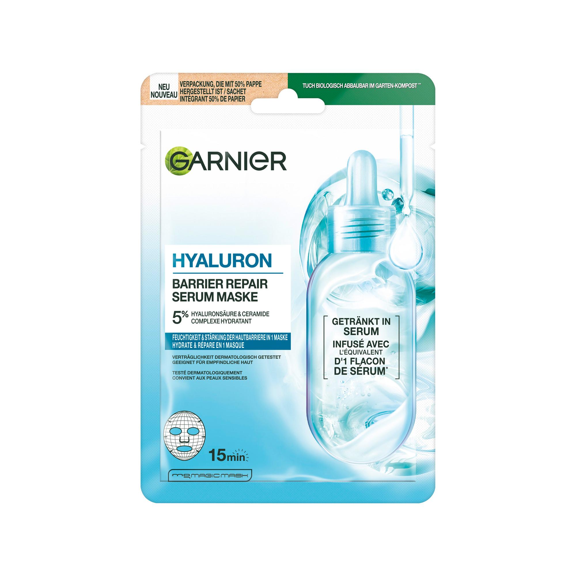 Die Hyaluron Barrier Repair Serum Maske ist eine Tuchmaske von Garnier, welche der Haut Feuchtigkeit spendet und die Hautschutzbarriere in nur 15 Minuten sowohl stärkt als auch repariert. Eingetaucht in das Äquivalent von einer Serumdosis, enthält die Maske einen hochwirksamen Feuchtigkeitskomplex aus 5% Hyaluronsäure und Ceramid. So wird die Haut nicht nur sofort belebt, sondern erhält auch eine tiefenwirksame Hydration. Nach nur einer Anwendung spendet die zarte Formel der Haut intensiv Feuchtigkeit und regeneriert gleichzeitig die Hautschutzbarriere – für ein samtig weiches und angenehm geschmeidiges Hautgefühl. Nach einer Woche fühlt sich die Haut gepflegter und revitalisiert an und erscheint sowohl glatter als auch regeneriert.