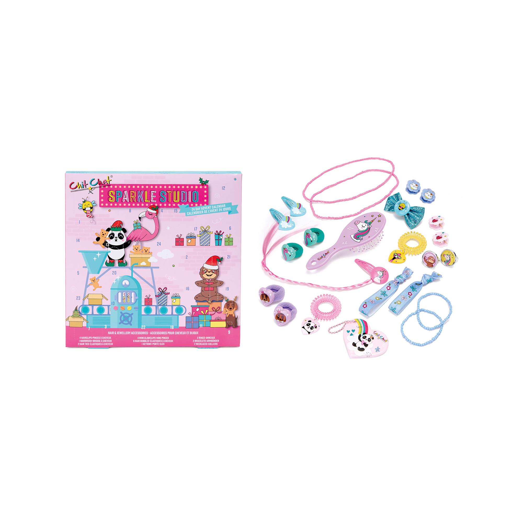 Hinter jedem Türchen des Chit Chat Sparkle Studio Adventskalenders verbirgt sich eine spannende Mischung an Accessoires. Enthält eine bunte Auswahl an Haaraccessoires, Ringen und Halsketten.
