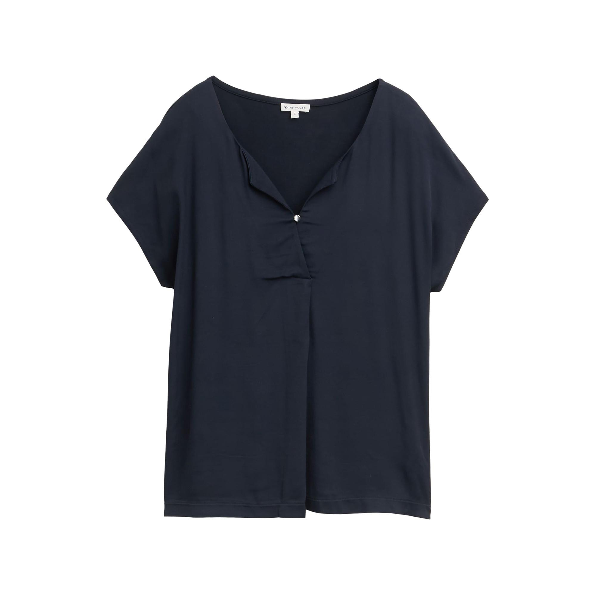 Dieses T-Shirt von Tom Tailor aus fliessender Viskose punktet mit einer eleganten Bügelfalte und einem Knopfverschluss am V-Ausschnitt. Der Regular Fit sorgt für eine angenehme Passform und macht das Shirt zum vielseitigen Begleiter. Es ist ideal für Büro und Freizeit – stilvoll und bequem zugleich.