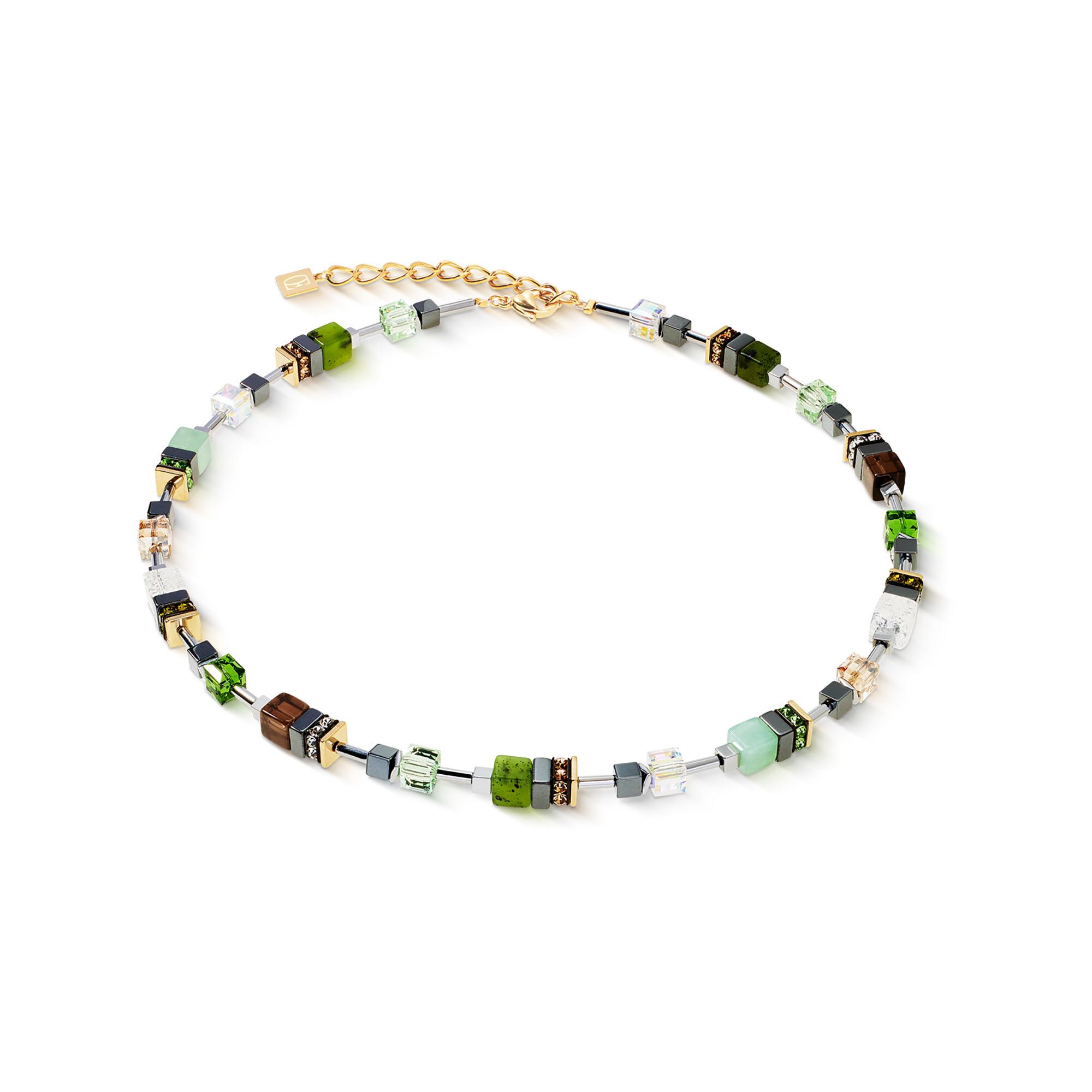 Die Halskette GeoCube Precious Motion Forest Light von Coeur de Lion in gold interpretiert das ikonische GeoCube Design neu mit dynamischer Eleganz. Mit Nephrit, Aventurin, Bergkristall und Rauchquarz entsteht ein harmonisches Farbspiel, veredelt durch Hämatit-Elemente mit modernen Akzenten.