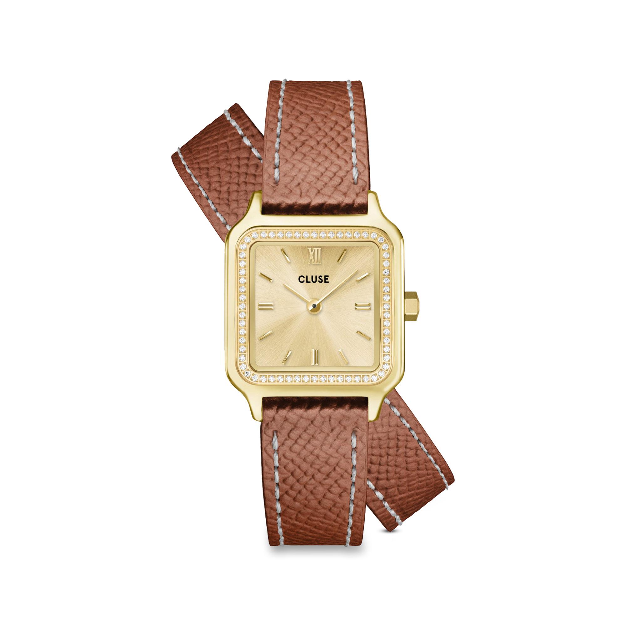 Die Cluse Gracieuse Petite Damenuhr begeistert mit ihrem goldfarbenen 24-mm-Gehäuse, veredelter Lünette mit weissen Steinen und einem eleganten, nussschalenbraunen Doppelarmband aus Leder mit feinen Nähten. Das goldfarbene Zifferblatt rundet das stilvolle Design ab und lässt sich dank Wechselarmband ganz individuell anpassen.