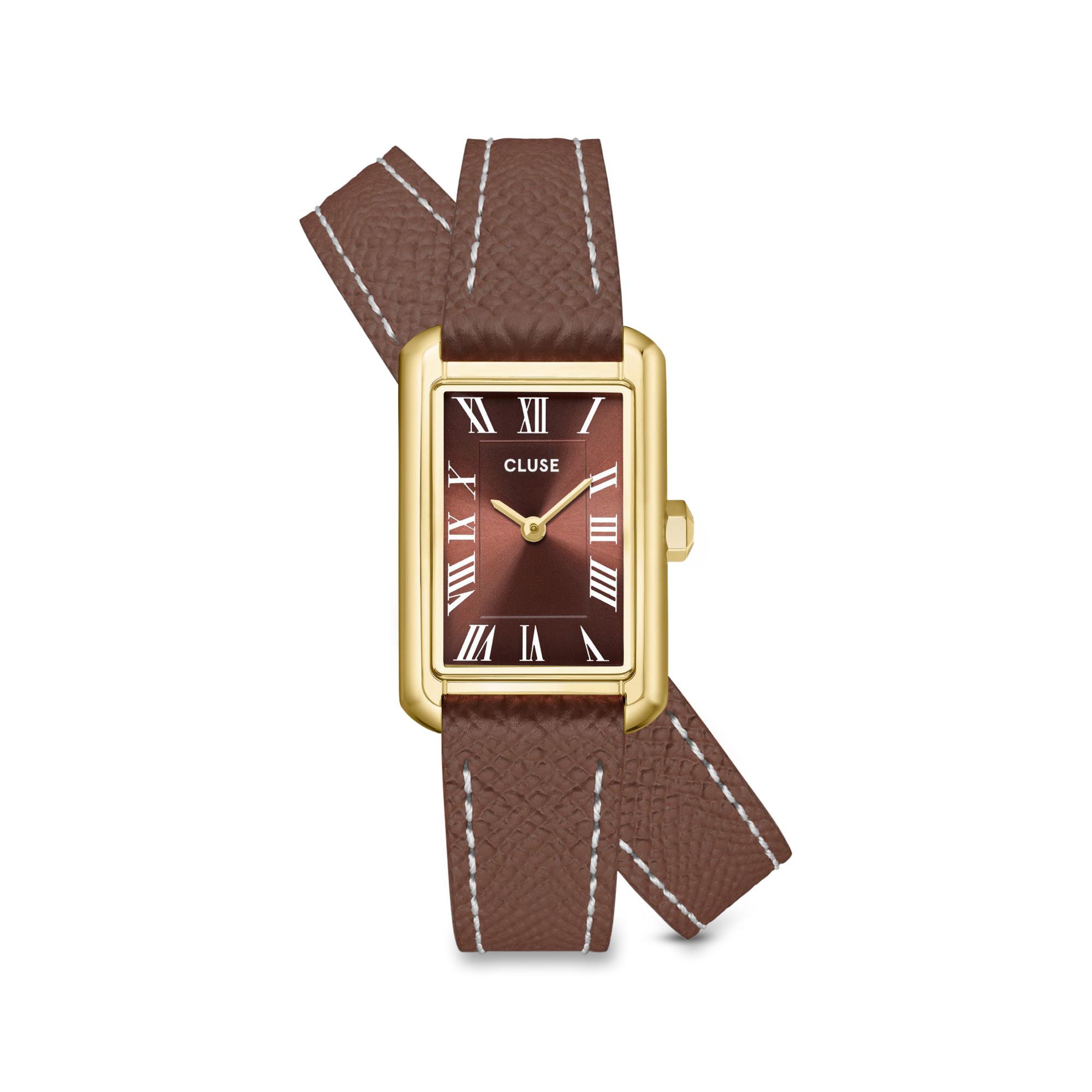 Die Marke Cluse präsentiert mit der Belisenna eine elegante Damenuhr mit rechteckigem 21 mm Gehäuse in Gold und einem doppelt getragenen, mocha-braunen Lederarmband mit weisser Naht. Das mocha-braune Zifferblatt verleiht der Uhr eine warme, stilvolle Ausstrahlung.