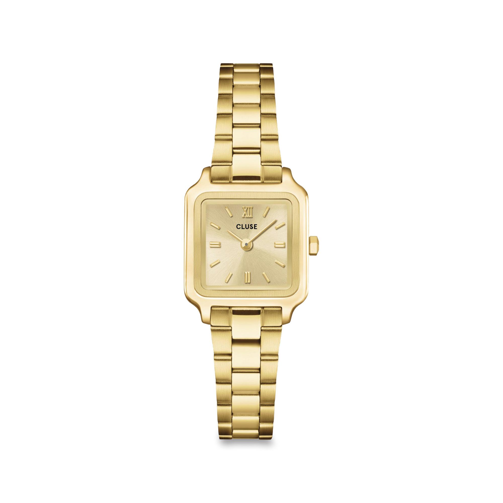 Die Marke Cluse präsentiert mit der Gracieuse Mini eine elegante Damenuhr mit quadratischem 21 mm Gehäuse in Gold und passendem Edelstahlarmband. Das goldfarbene Zifferblatt unterstreicht das harmonische, luxuriöse Design der Uhr.