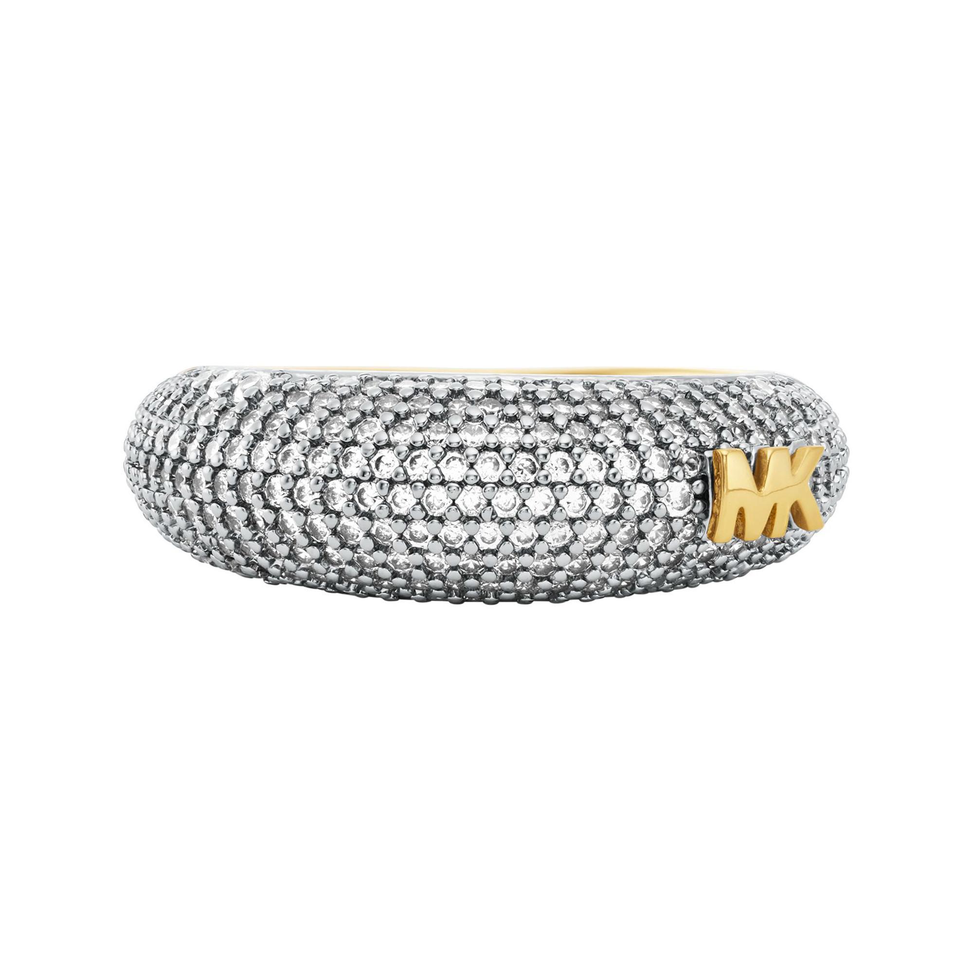 Der Michael Kors Metallic Muse Ring vereint zweifarbiges Design mit funkelnden Pavé-Akzenten und bietet einen modernen, eleganten Look. Seine gewölbte Silhouette eignet sich sowohl für sich allein als auch für ein stylisches Stacking mit weiteren Ringen.