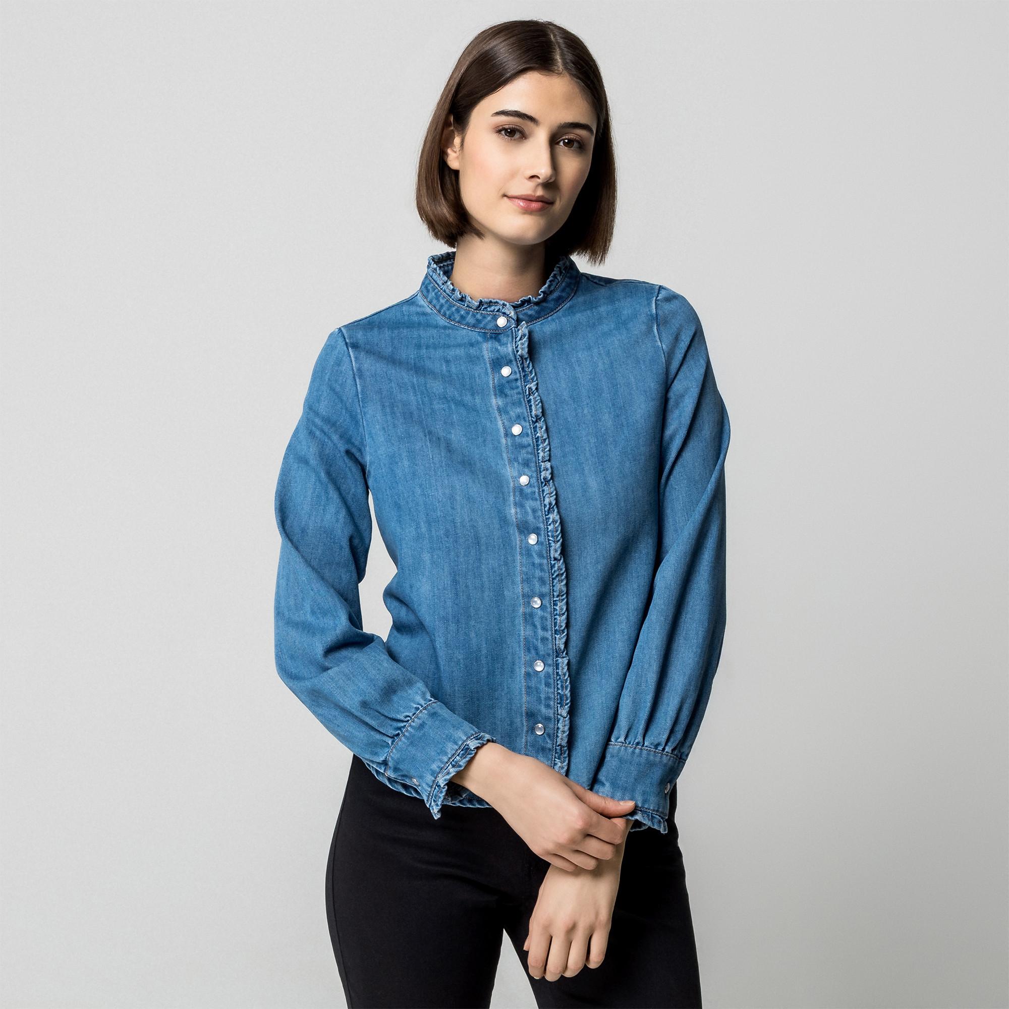 Diese Denim-Bluse verfügt über einen Stehkragen mit zarten Rüschen, der einem klassischen Stil einen Hauch von Eleganz verleiht. Die durchgehende Knopfleiste ist mit passenden Rüschen verziert, was einen stimmigen und stilvollen Look schafft. Die langen Ärmel sind mit geknöpften Manschetten versehen, die ein gepflegtes Erscheinungsbild gewährleisten.