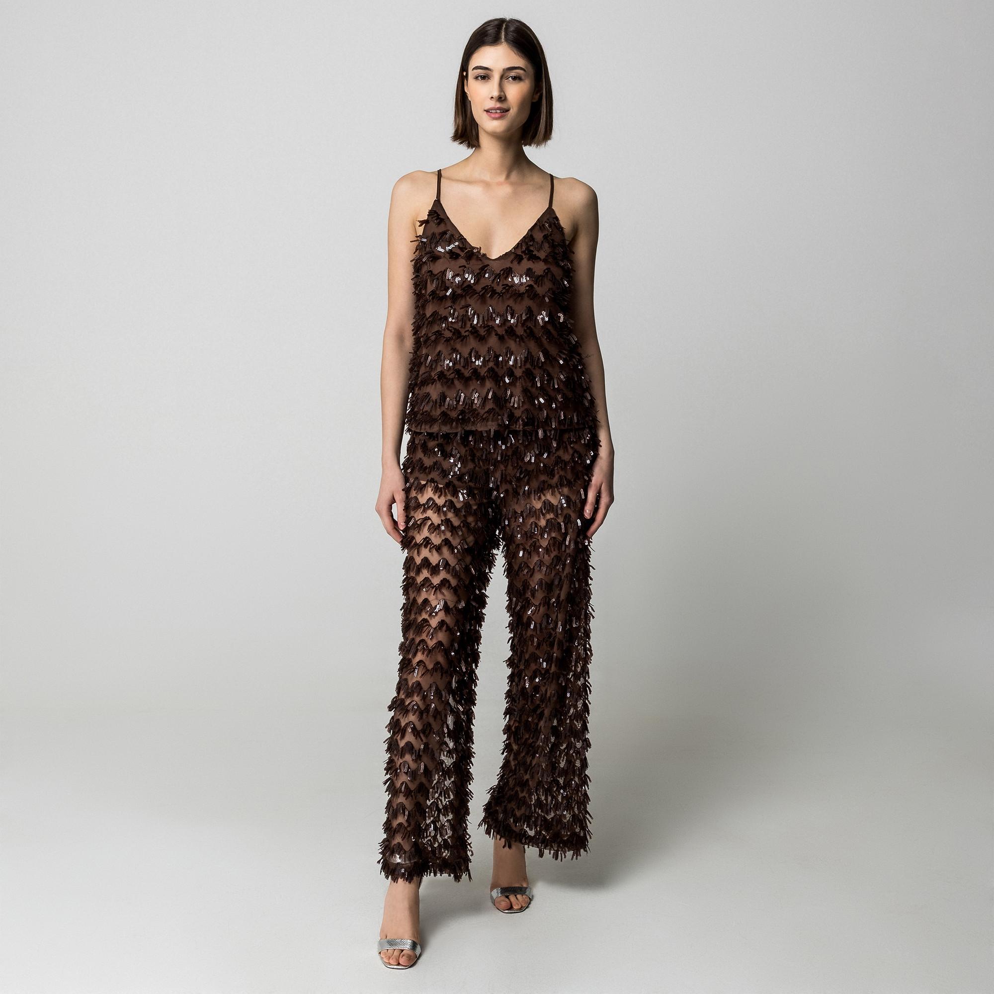 Dieses Camisole Top verfügt über einen V-Ausschnitt und zarte Spaghettiträger, die eine schicke und elegante Silhouette bieten. Das gesamte Top ist mit schimmernden Pailletten verziert, die eine dynamische und auffällige Textur erzeugen, die sich wunderschön bewegt.