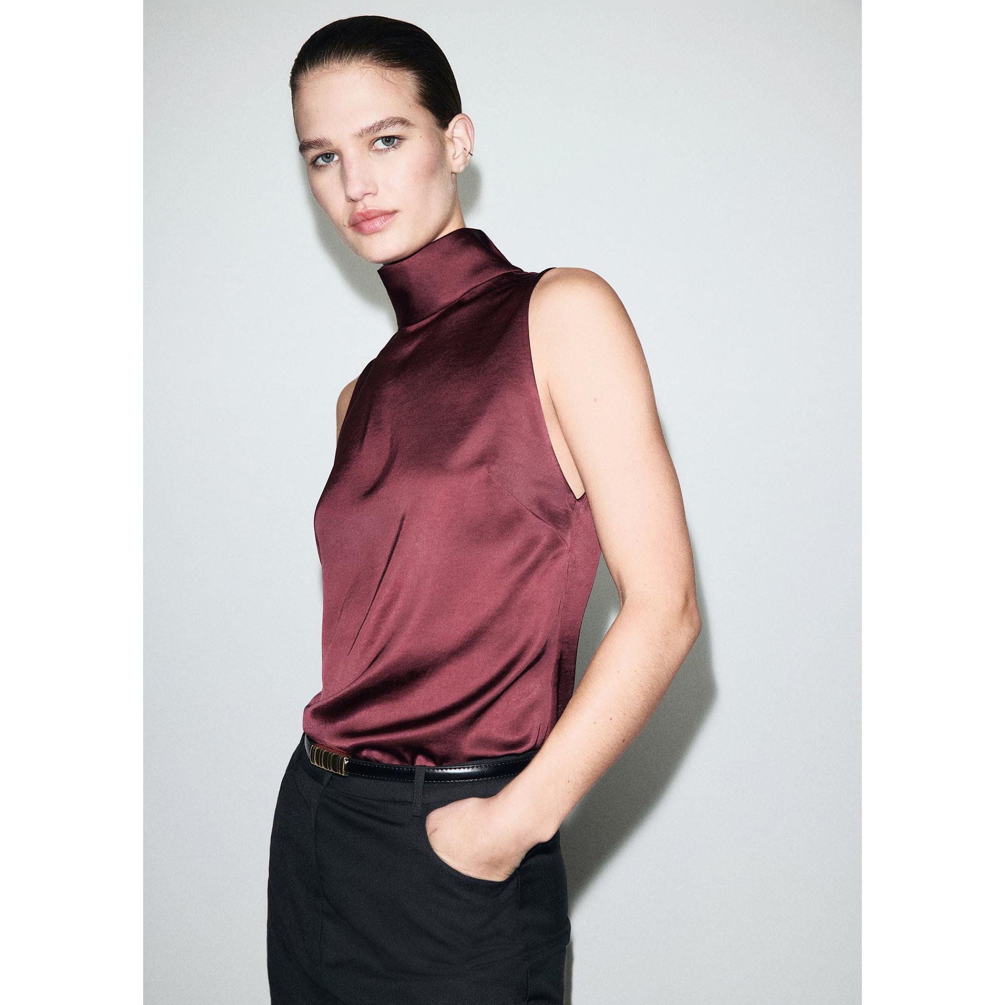 Die satinierte Bluse überzeugt mit einem eleganten Rollkragen und leicht glänzender Oberfläche. Ihr fliessender Stoff und das ärmellose Design verleihen dem Look eine raffinierte Note. Diese Bluse ist ideal für stilvolle Kombinationen – ob im Büro oder bei besonderen Anlässen.