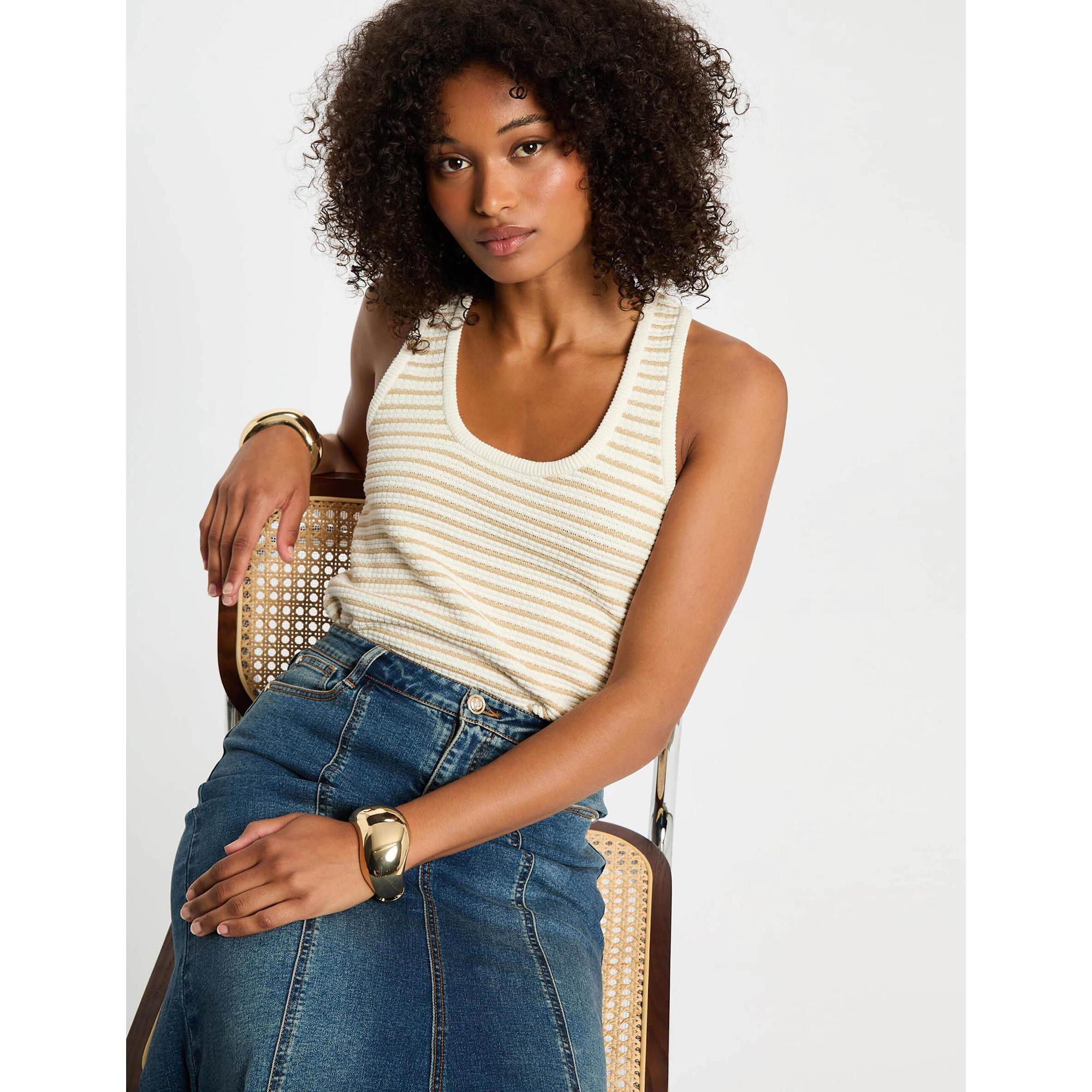 Dieses ärmellose Stricktop von Morgan besticht durch seinen geraden Schnitt und feinen Strick mit horizontalen Streifen. Metallisierte Fäden verleihen dem Design einen dezenten Glanz und machen es zu einem eleganten Hingucker. Es ist ideal für sommerliche Layering-Looks oder als stilvolle Ergänzung zu Jeans und Blazer.