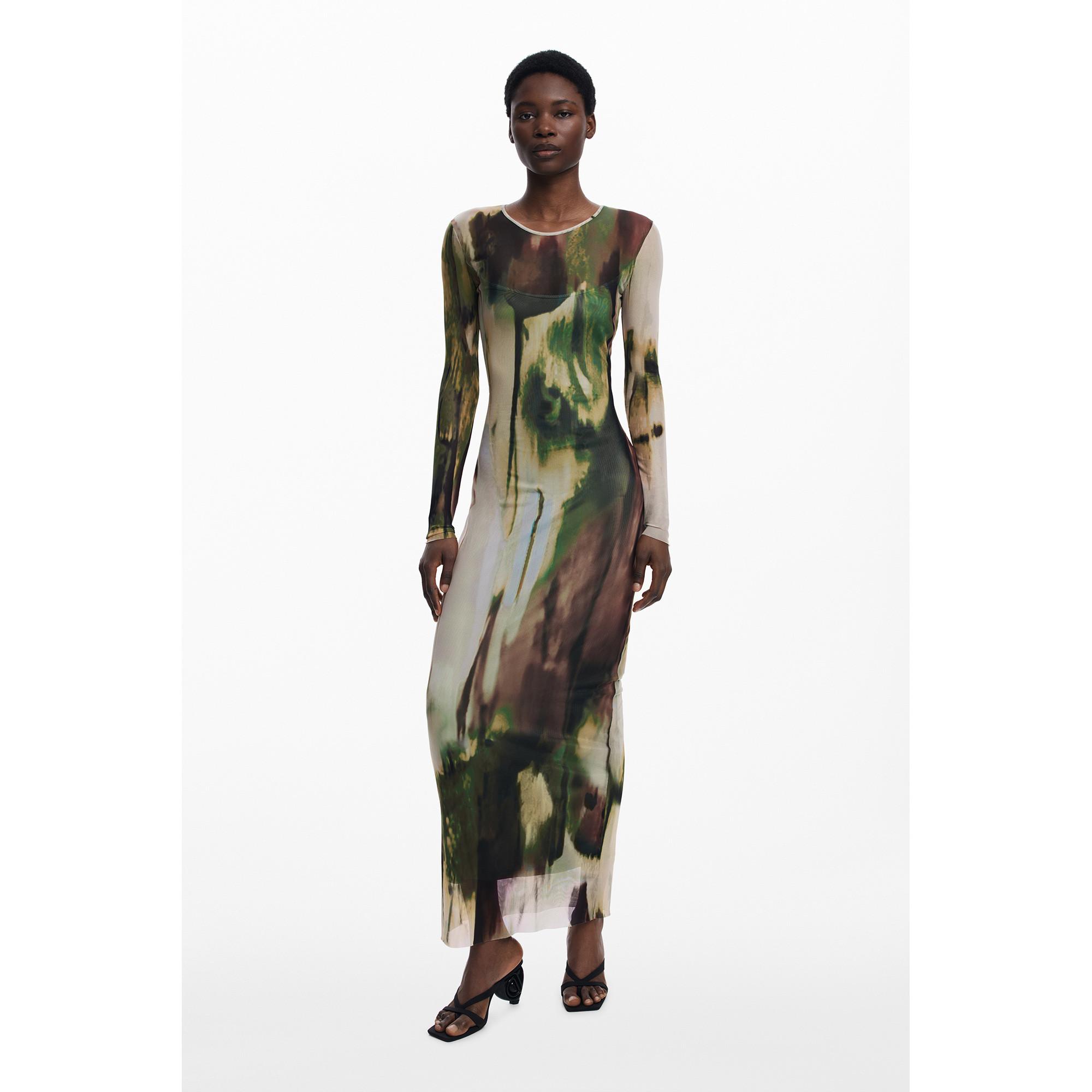 Das lange Tüllkleid von Desigual hat lange Ärmel, einen leicht erhöhten Kragen und ein Bandeau-Futter. Der Arty-Print in Grüntönen und die Slim-Fit-Passform verleihen dem Kleid eine elegante Silhouette. Gefertigt aus recyceltem Polyester.