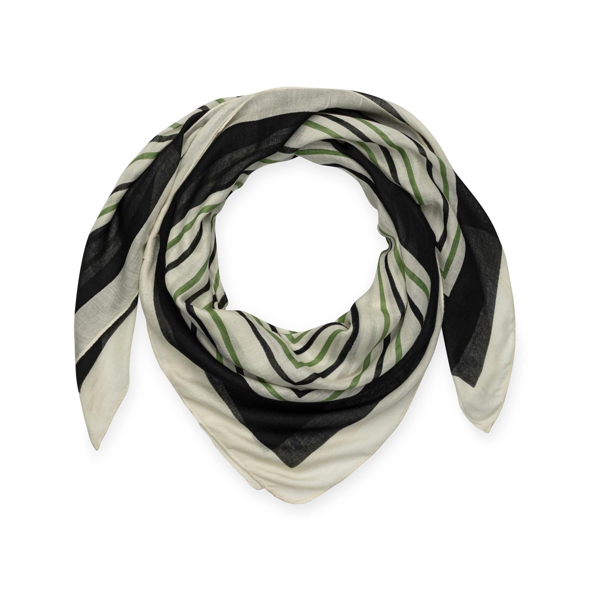 Dieser Schal präsentiert ein auffälliges Streifenmuster in Schwarz, Grün und Weiss und ist ein vielseitiges Accessoire für verschiedene Outfits. Sein Design ermöglicht mehrere Styling-Optionen und verleiht jedem Look einen Hauch von Eleganz.
