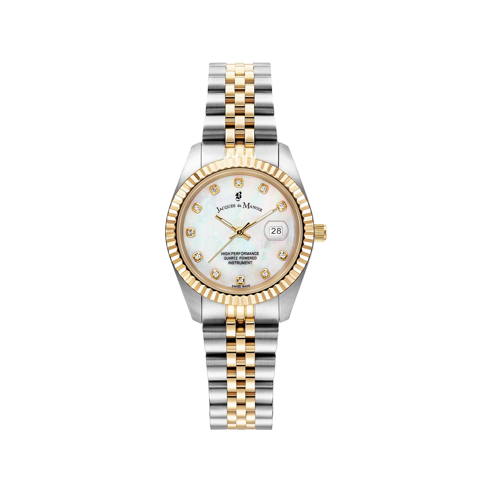 Die Jacques Du Manoir Uhr präsentiert sich mit einem kompakten 31-mm-Edelstahlgehäuse, einer klassischen 3-Zeiger-Anzeige mit Datum und widerstandsfähigem Mineralglas. Das Edelstahlarmband rundet das elegante Design ab und sorgt zusammen mit der 5 ATM Wasserdichtigkeit für Alltagstauglichkeit.