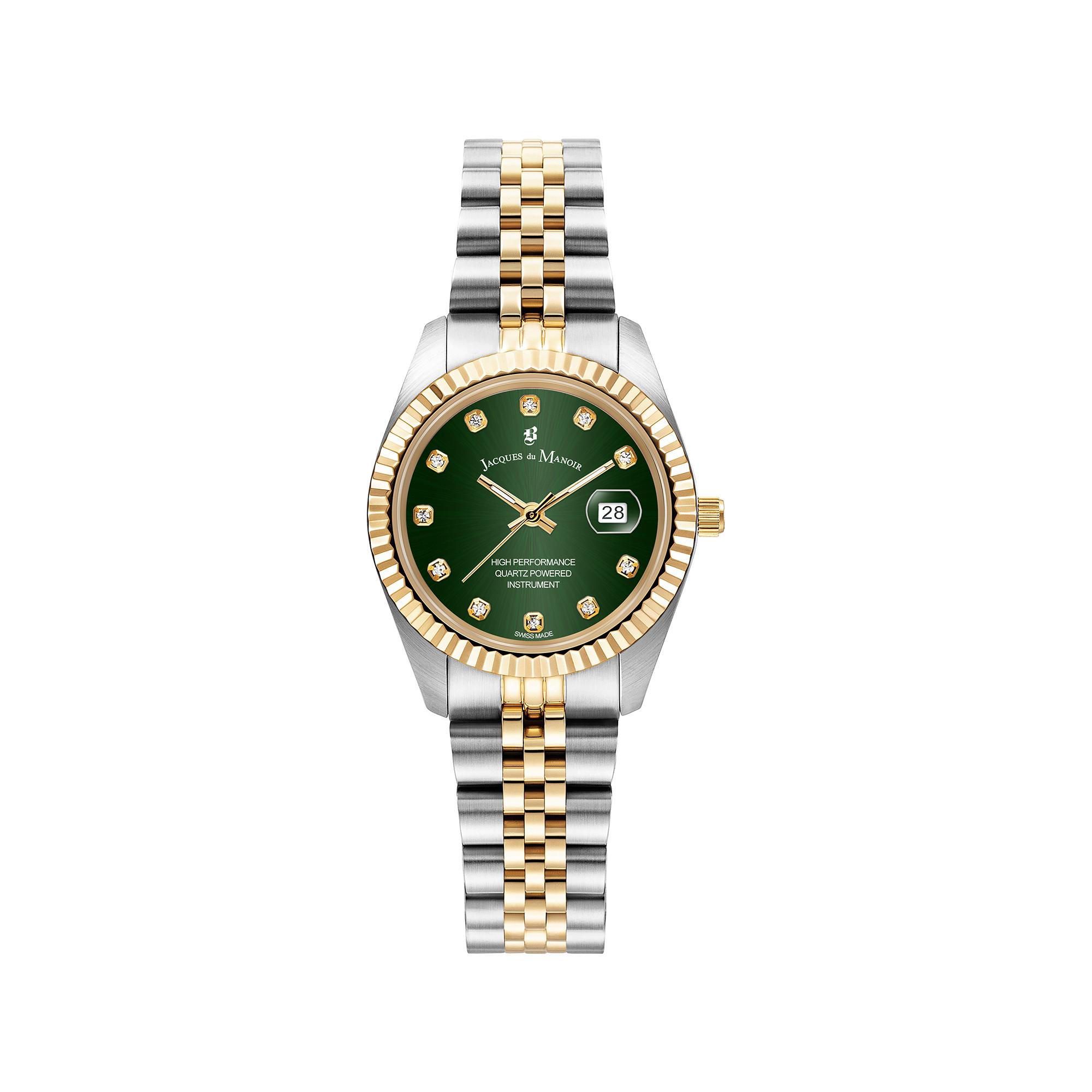 Die Jacques Du Manoir Uhr präsentiert sich mit einem kompakten 31-mm-Edelstahlgehäuse, einer klassischen 3-Zeiger-Anzeige mit Datum und widerstandsfähigem Mineralglas. Das Edelstahlarmband rundet das elegante Design ab und sorgt zusammen mit der 5 ATM Wasserdichtigkeit für Alltagstauglichkeit.