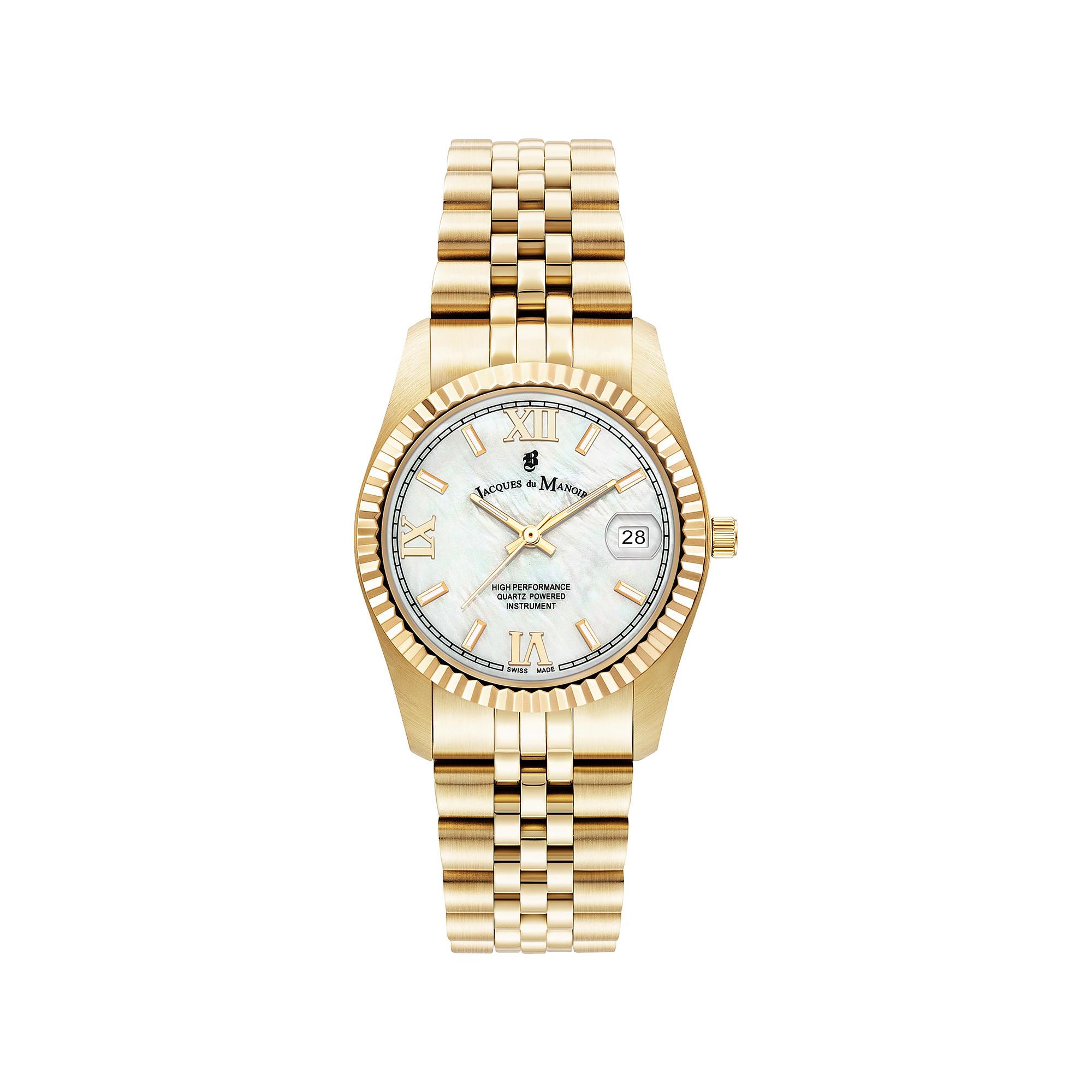 Die Jacques Du Manoir Uhr besticht durch ein 34-mm-Edelstahlgehäuse, eine klassische 3-Zeiger-Anzeige mit Datum und ein edles Zifferblatt aus Perlmutt. Das Edelstahlarmband ergänzt das elegante Design, während die 5 ATM Wasserdichtigkeit für Alltagstauglichkeit sorgt.