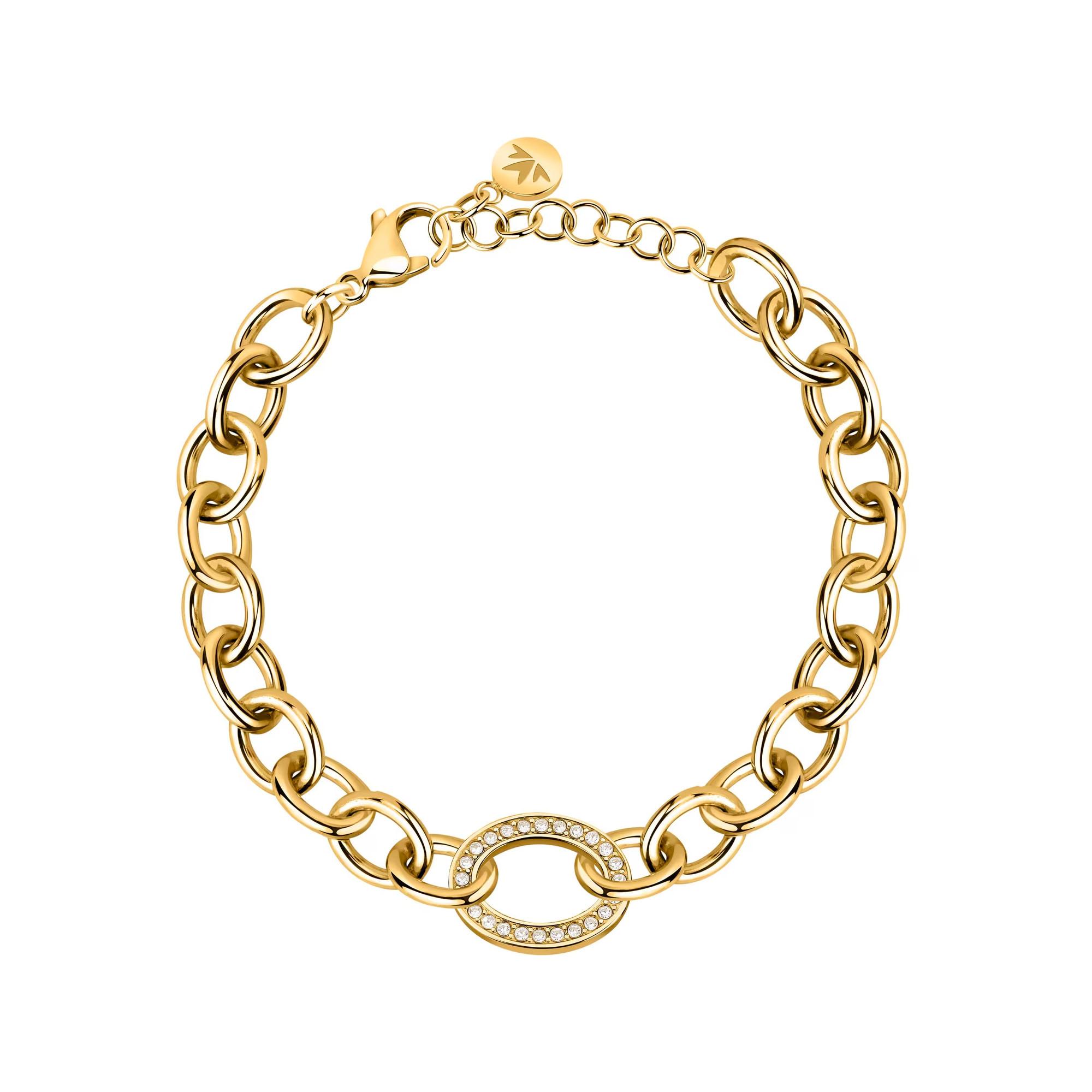 Das Armband Intrecci von Morellato aus goldfarbenem Edelstahl ist mit funkelnden weissen Kristallen verziert und verleiht jedem Outfit einen eleganten Glanz. Es wird in der originalen Morellato-Verpackung mit Echtheitszertifikat geliefert.