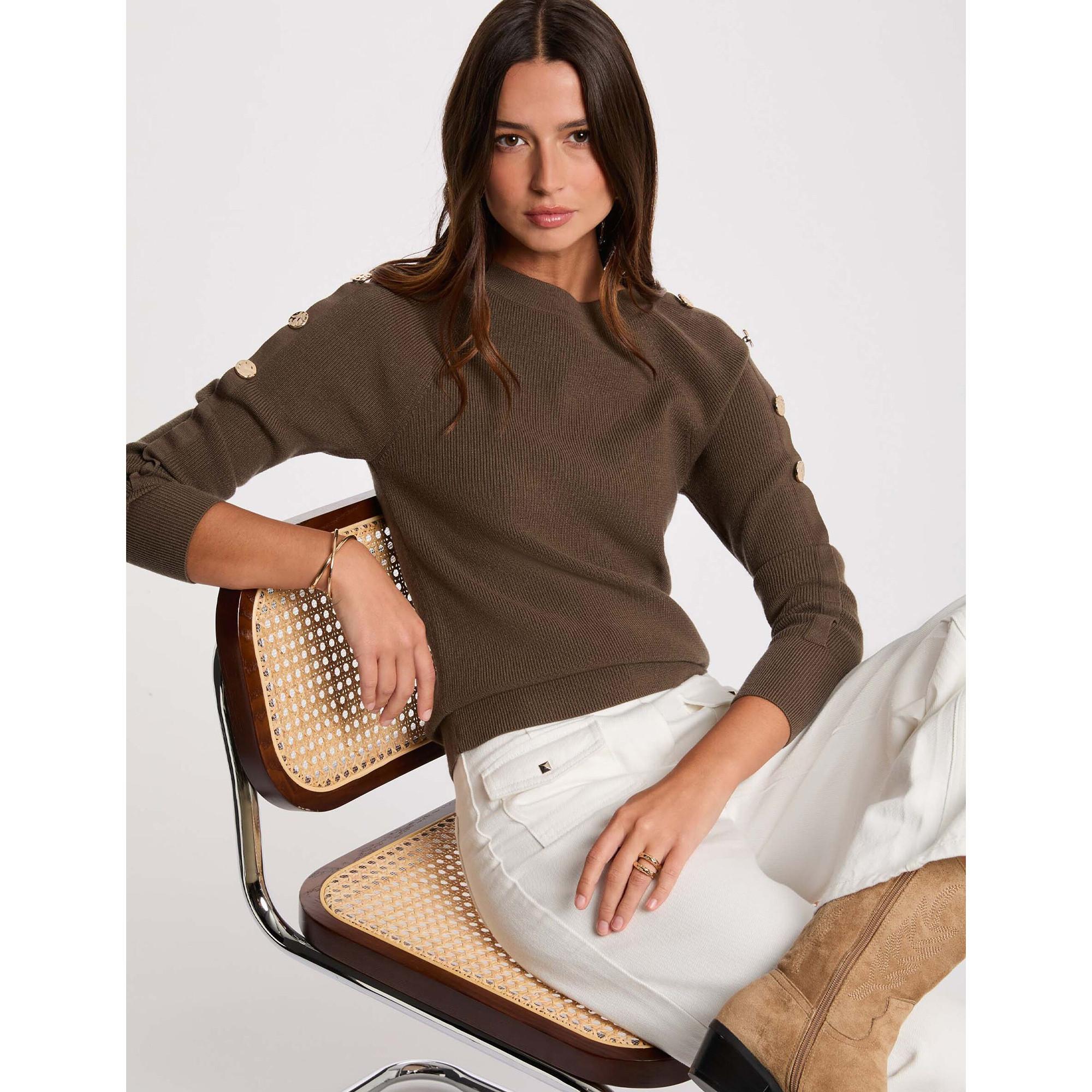 Dieser Pullover hat einen geraden Schnitt mit U-Boot-Ausschnitt und langen Ärmeln – ideal für einen eleganten, femininen Look. Die feine Strickart und die dekorativen Knöpfe an den Schultern verleihen dem Design Raffinesse und Charakter. Er passt perfekt zu Jeans, Rock oder Stoffhose für einen stilvollen Auftritt im Alltag oder Büro.
