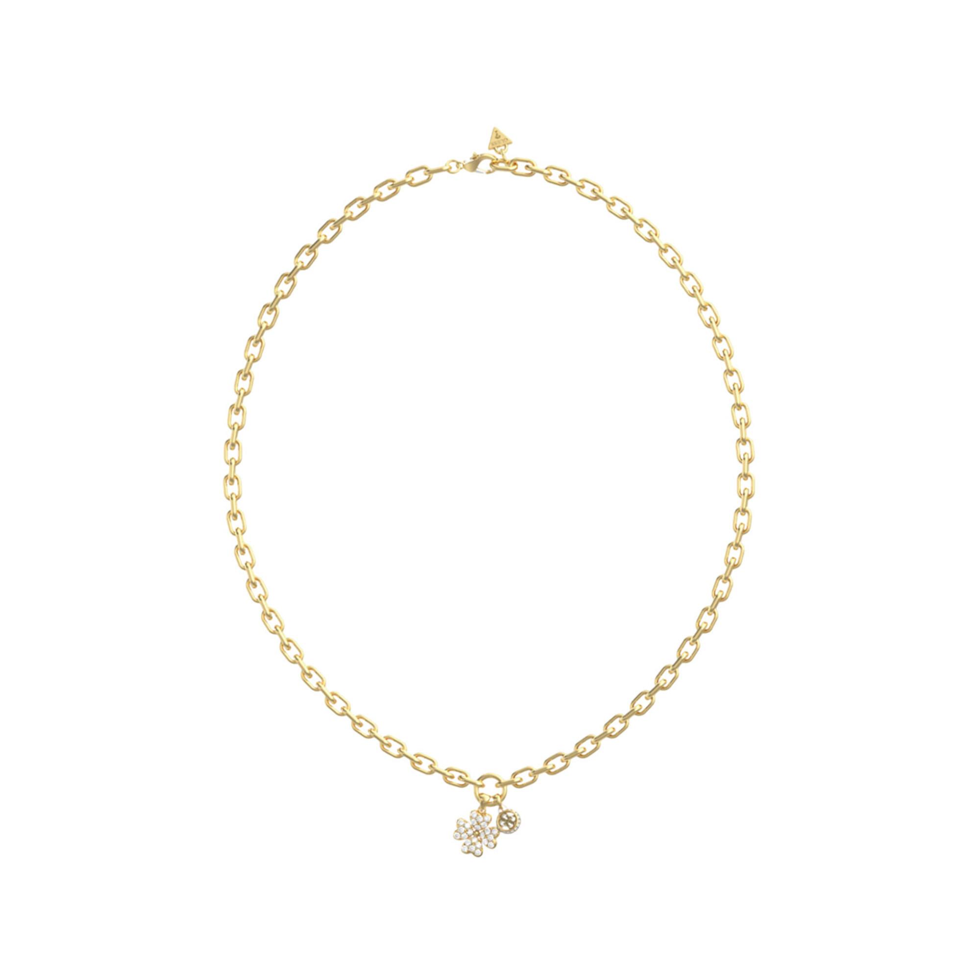 Dieses Damenkollier von Guess besteht aus robustem Stahl mit vergoldeter Oberfläche und überzeugt mit eleganter, markanter Optik. Das steinbesetzte Design verleiht einen zeitlosen Touch und macht es zum idealen Accessoire für jeden Anlass – zudem wirkt es als Glücksbringer für die Trägerin.
