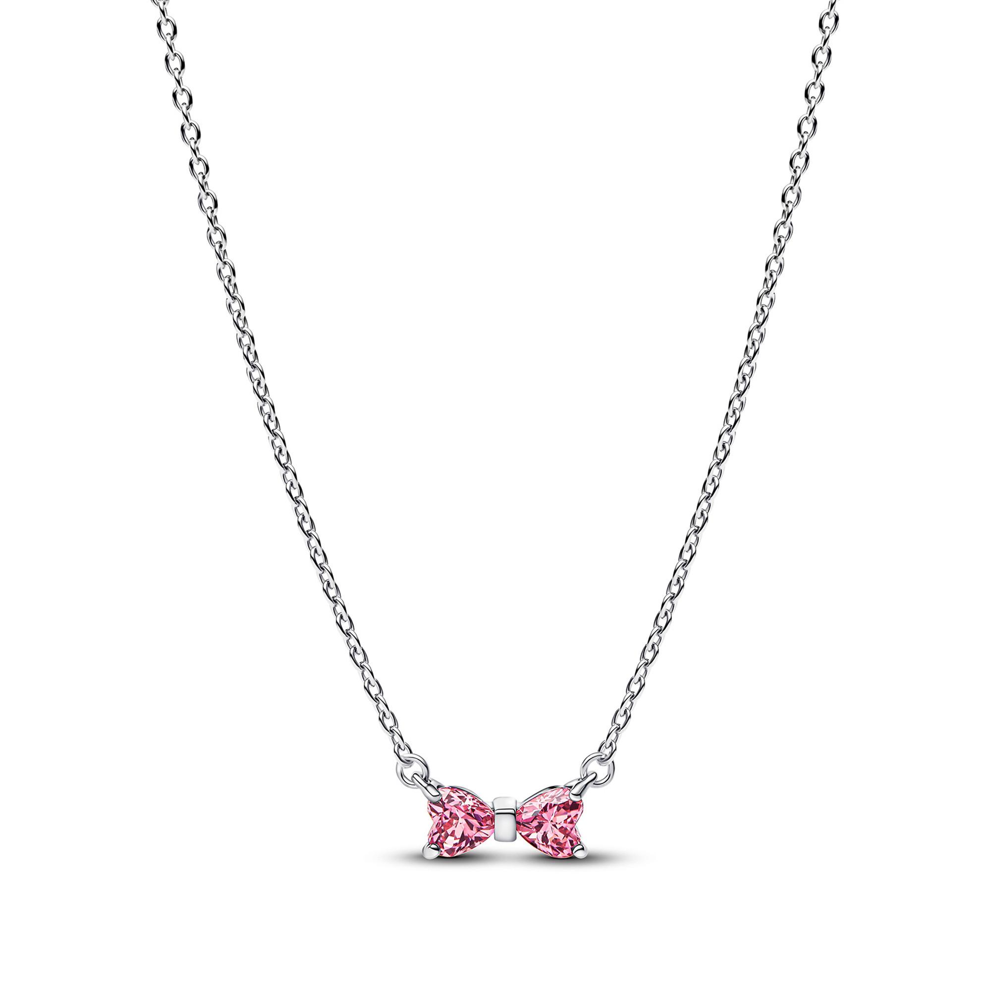 In Liebe verbunden. An dieser Halskette aus Sterling-Silber bilden zwei rosafarbene herzförmige Steine eine Schleife, die an der Kette befestigt ist. Sie ist auf drei verschiedene Längen verstellbar und verleiht deinem Look einen Hauch von Anmut und Schönheit.
