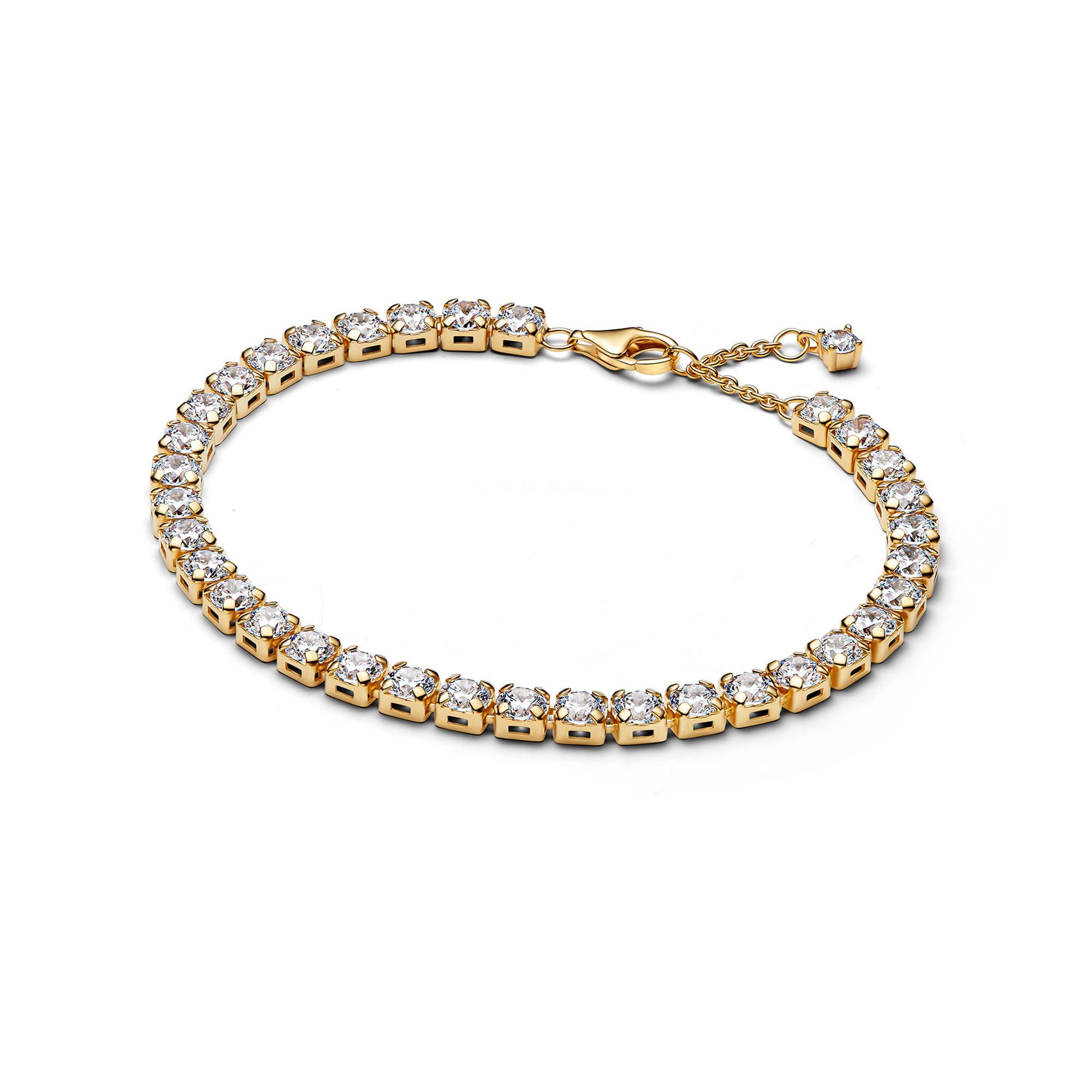 Feiere die besonderen Momente des Lebens mit einem strahlenden Tennisarmband. Es ist rundum mit Steinen besetzt und mit 14 Karat Gold plattiert, was für einen zeitlosen Look auf dem Platz und und ausserhalb sorgt.