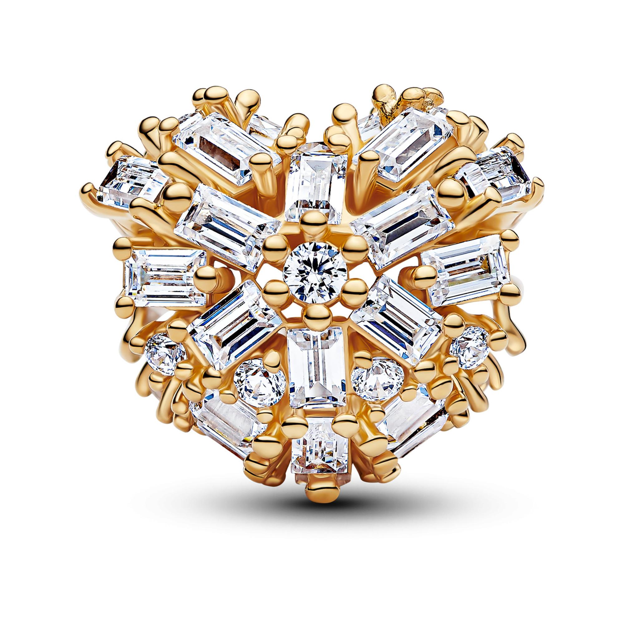Lass deine Liebe strahlen. Dieses funkelnde Charm mit 14 Karat Vergoldung ist mit klaren Cubic Zirkonia besetzt, die ein Herz bilden, das das Licht aus jedem Winkel einfängt – ein zeitloses Symbol für Wärme und Freundlichkeit.