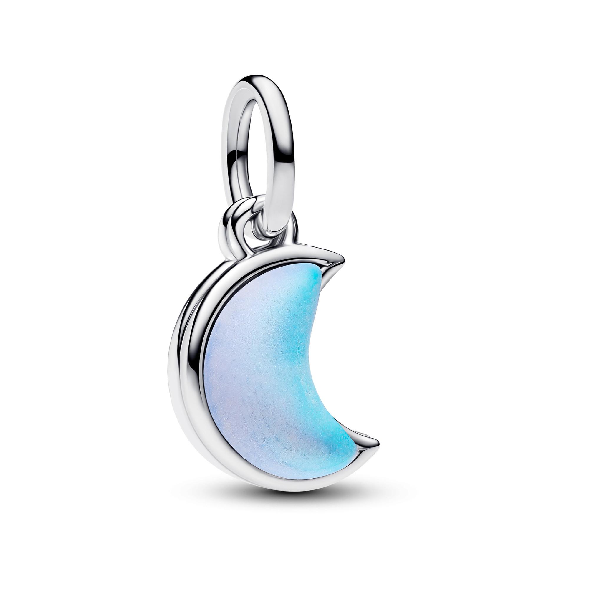 Verschenke den Mond. Dieser doppelte Charm-Anhänger aus Sterling-Silber zeigt eine Mondsichel aus irisierendem Mondstein-Glas und eine andere mit einer eingravierten Botschaft. Eine strahlende Erinnerung an den unendlichen Glanz der Liebe.