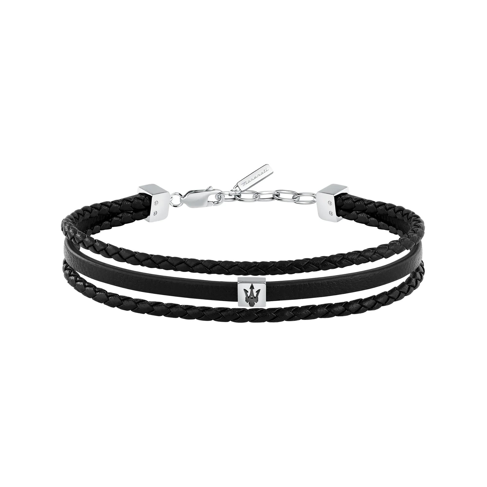 Maserati Armband für Herren kombiniert schwarzes Leder mit stilvollen Edelstahl-Details. Das dreifache Lederband wird durch silberne und schwarze Elemente sowie das dezente Maserati-Logo betont und lässt sich dank des Magnetverschlusses bequem anpassen.