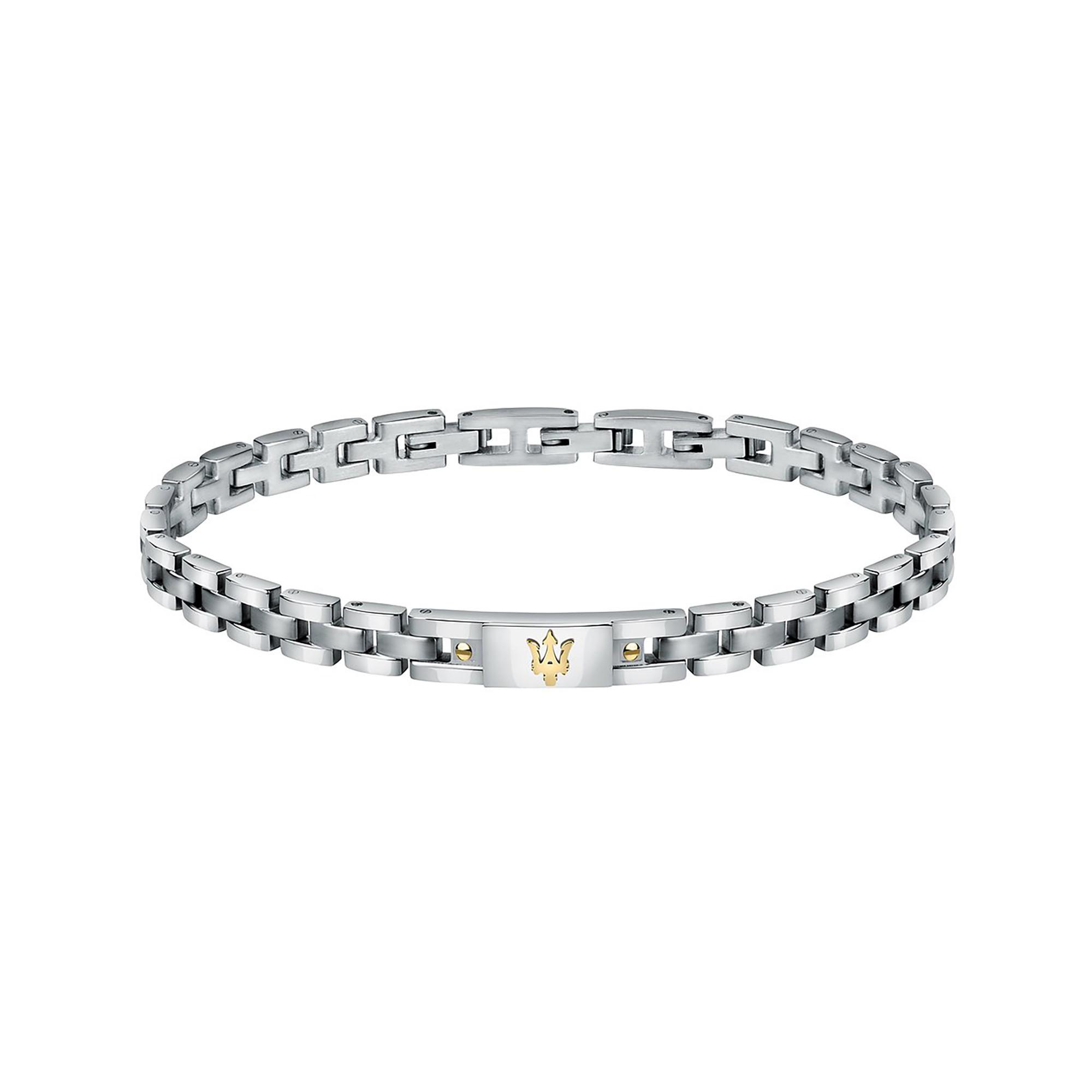 Dieses Herrenarmband von Maserati besticht durch eine elegante Kombination aus schmalen Edelstahl-Gliedern und einem markanten Mittelstück. Das mittlere Rechteck zeigt das MASERATI-Logo in glänzendem Gold, ergänzt durch zwei kleine goldene Punkte – ein stilvolles Detail für jeden Look.