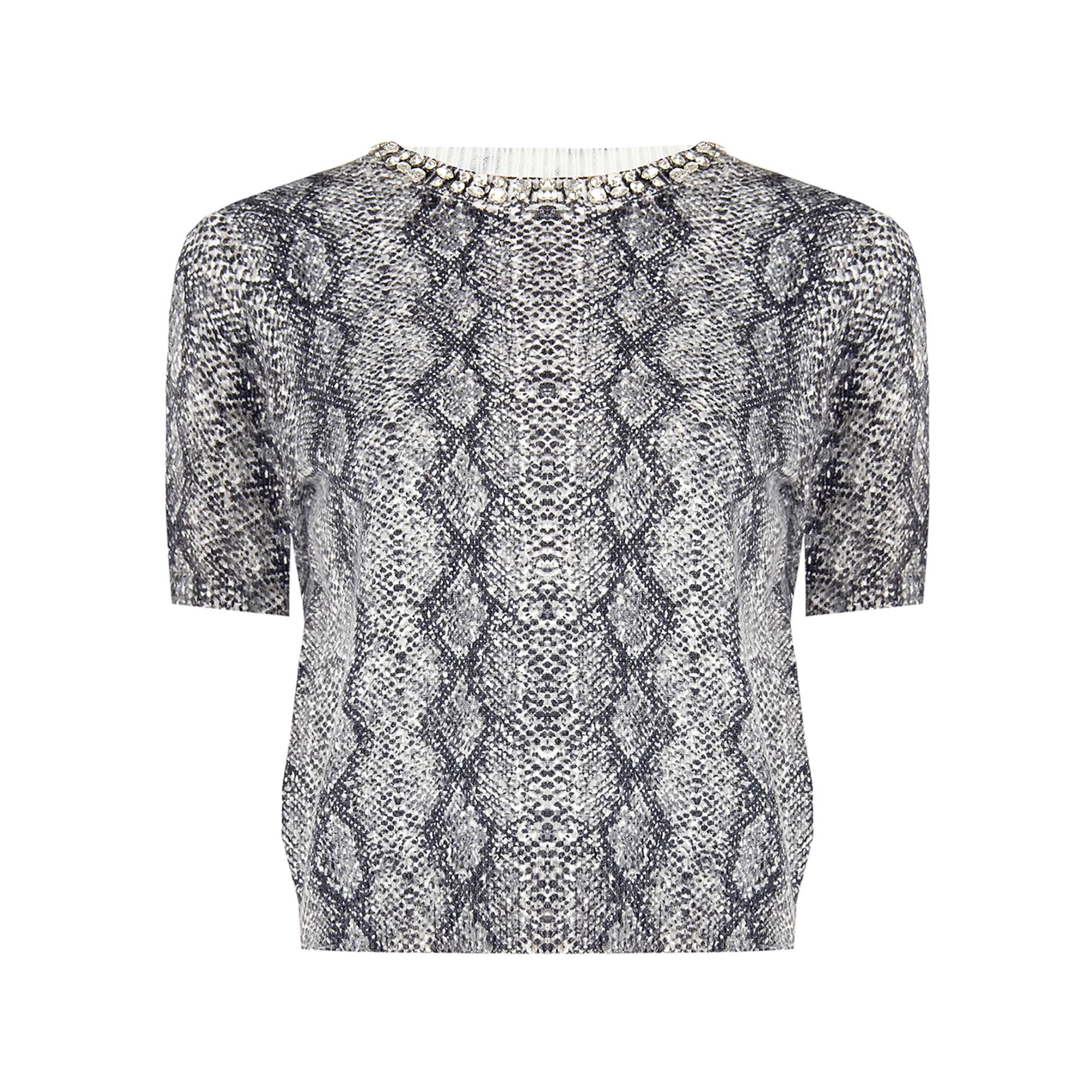 Dieser Pullover präsentiert ein auffälliges Schlangenmuster, das das gesamte Kleidungsstück bedeckt und ein kühnes sowie modisches Statement setzt. Der Rundhalsausschnitt ist mit eleganten Verzierungen versehen, die dem Design einen Hauch von Raffinesse verleihen. Mit seinen kurzen Ärmeln ist dieser Pullover ein vielseitiges Kleidungsstück für verschiedene Anlässe.