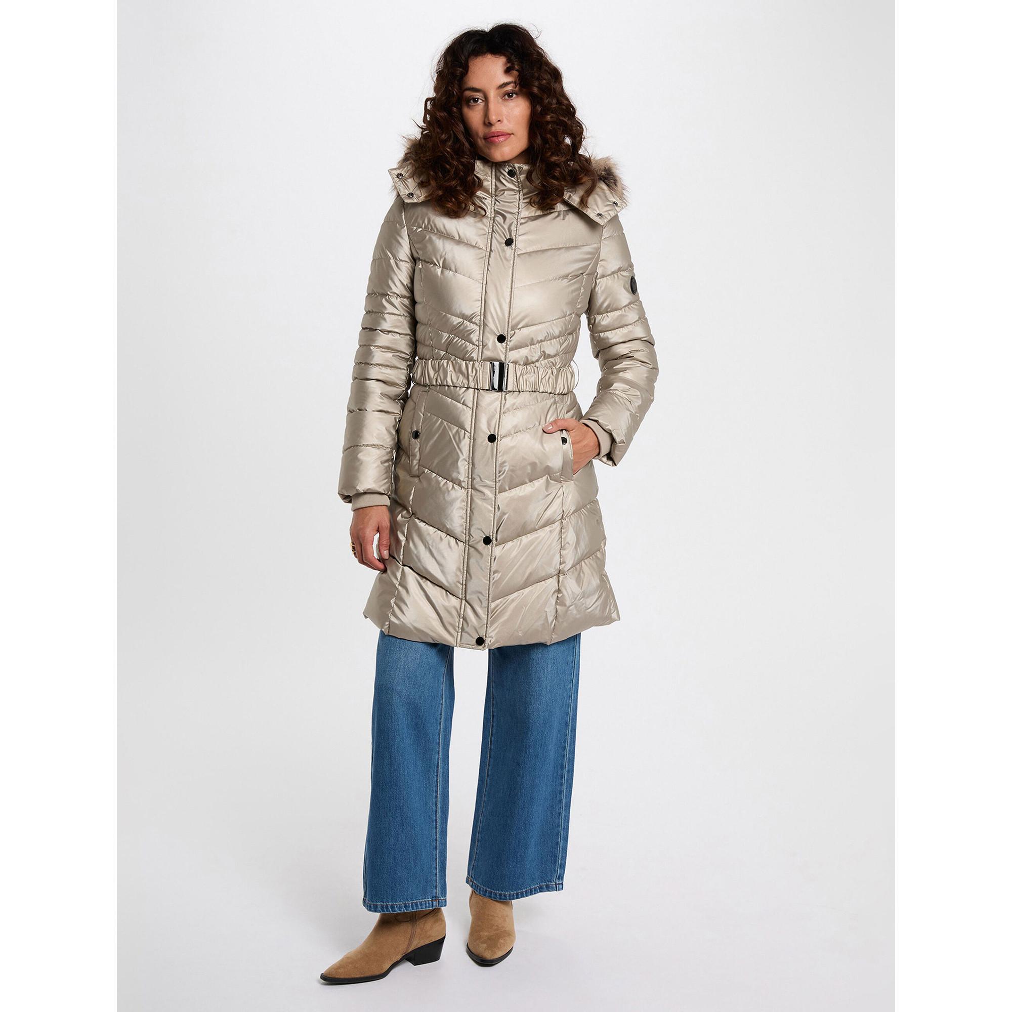 Diese mittellange Daunenjacke von Morgan kombiniert femininen Chic mit funktionalem Design. Der glänzende Stoff, der taillierte Schnitt und ein eleganter Gürtel sorgen für eine definierte Silhouette. Die Kapuze und die Druckknopfleiste bieten Schutz und Komfort an kühlen Tagen. Sie ist ideal für Casual-Chic-Looks, ob mit weiter Jeans oder fliessendem Midirock.