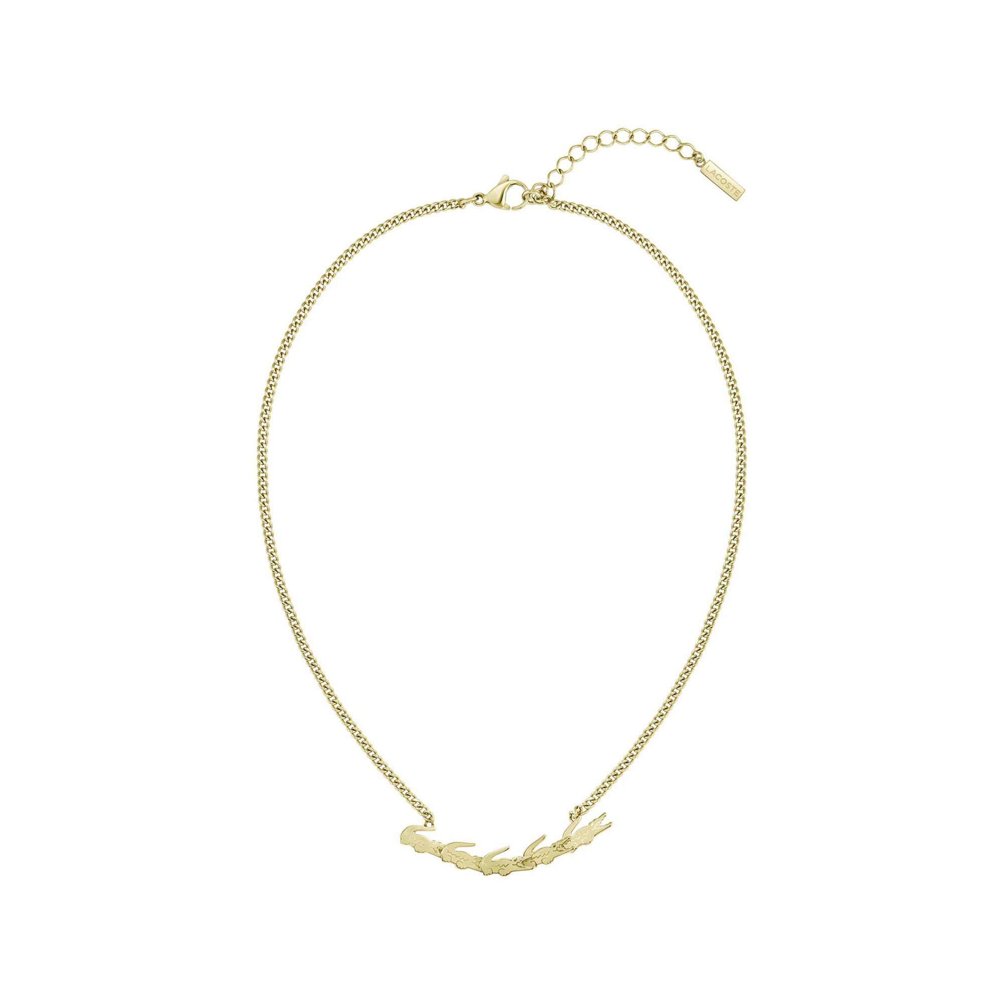 Die Lacoste Damenhalskette Crile vereint elegantes Design mit markanten Details. Aus goldfarbenem Edelstahl gefertigt, überzeugt sie durch Panzergliederung, funkelnde Steinchen auf dem mittleren Krokodil-Anhänger und individuell anpassbare Länge.