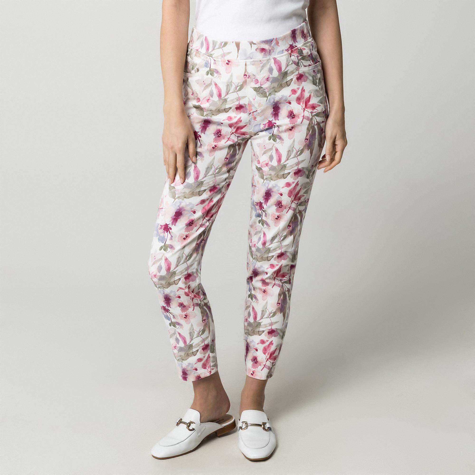 Diese 5-Pocket-Hose präsentiert sich mit einem lebhaften Blumenmuster und sorgt für einen frischen und stilvollen Look. Das Design umfasst einen klassischen 5-Pocket-Stil, der sowohl Funktionalität als auch eine zeitlose Ästhetik bietet. Die Hose ist vielseitig gestaltet und eignet sich für verschiedene Anlässe.