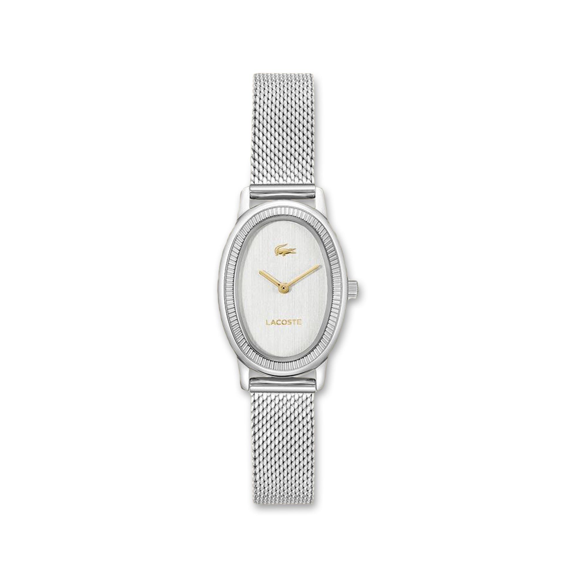 Die Lacoste Parisienne besticht durch zeitlose Eleganz und ein raffiniertes Design. Das ovale Gehäuse, inspiriert von Tennis-Faltenröcken, harmoniert perfekt mit dem schimmernden Ziffernblatt, und das Armband aus Edelstahl rundet das stilvolle Gesamtbild ab.