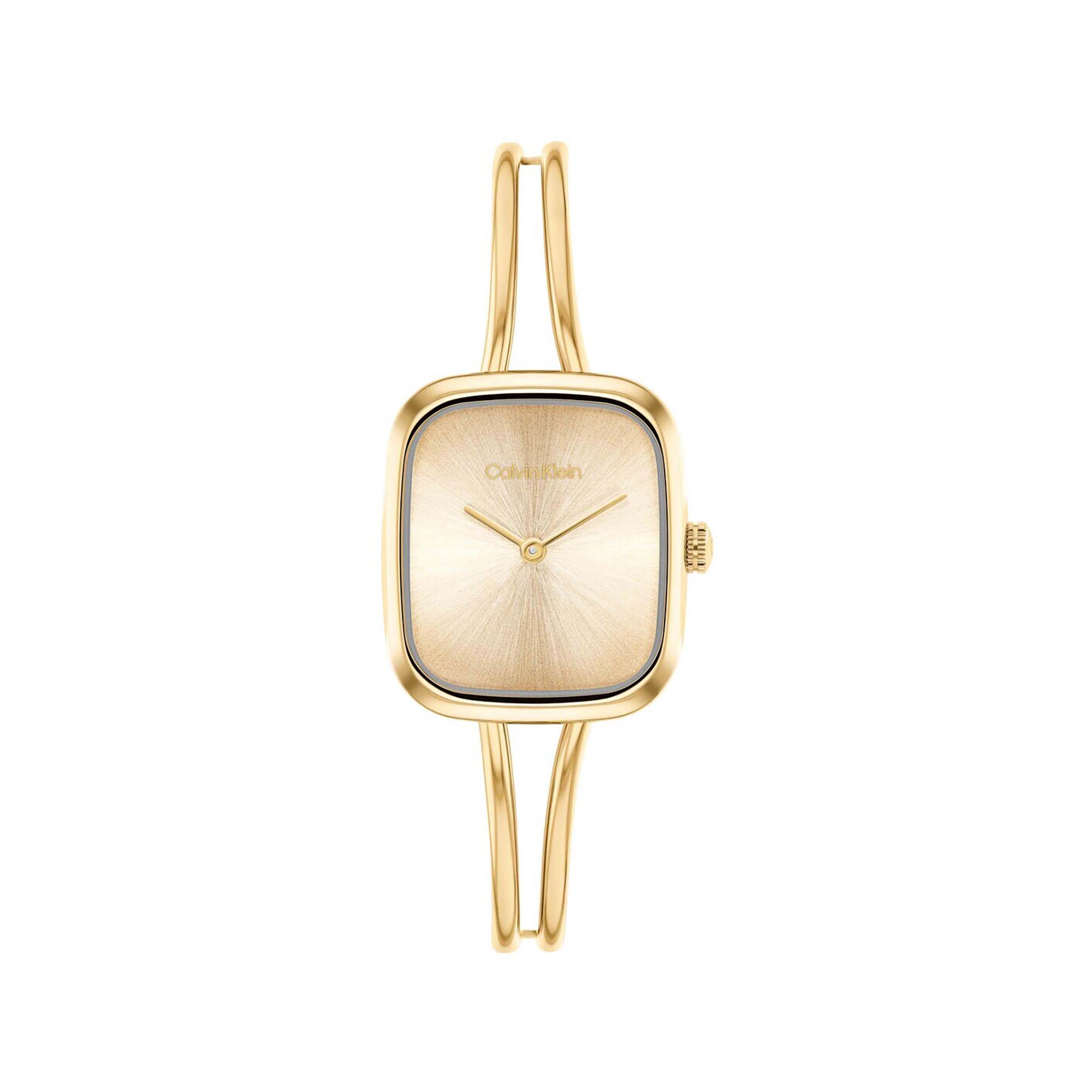 Die Calvin Klein CK Adore Damenuhr verbindet elegantes design mit hochwertiger verarbeitung aus gelbgoldfarbenem edelstahl/pvd. Das eckige gehäuse mit 20.8 mm durchmesser und 6.5 mm hoehe, sowie das goldfarbene ziffernblatt mit kratzfestem mineralglas sorgen fuer einen modernen look und hohen tragekomfort.