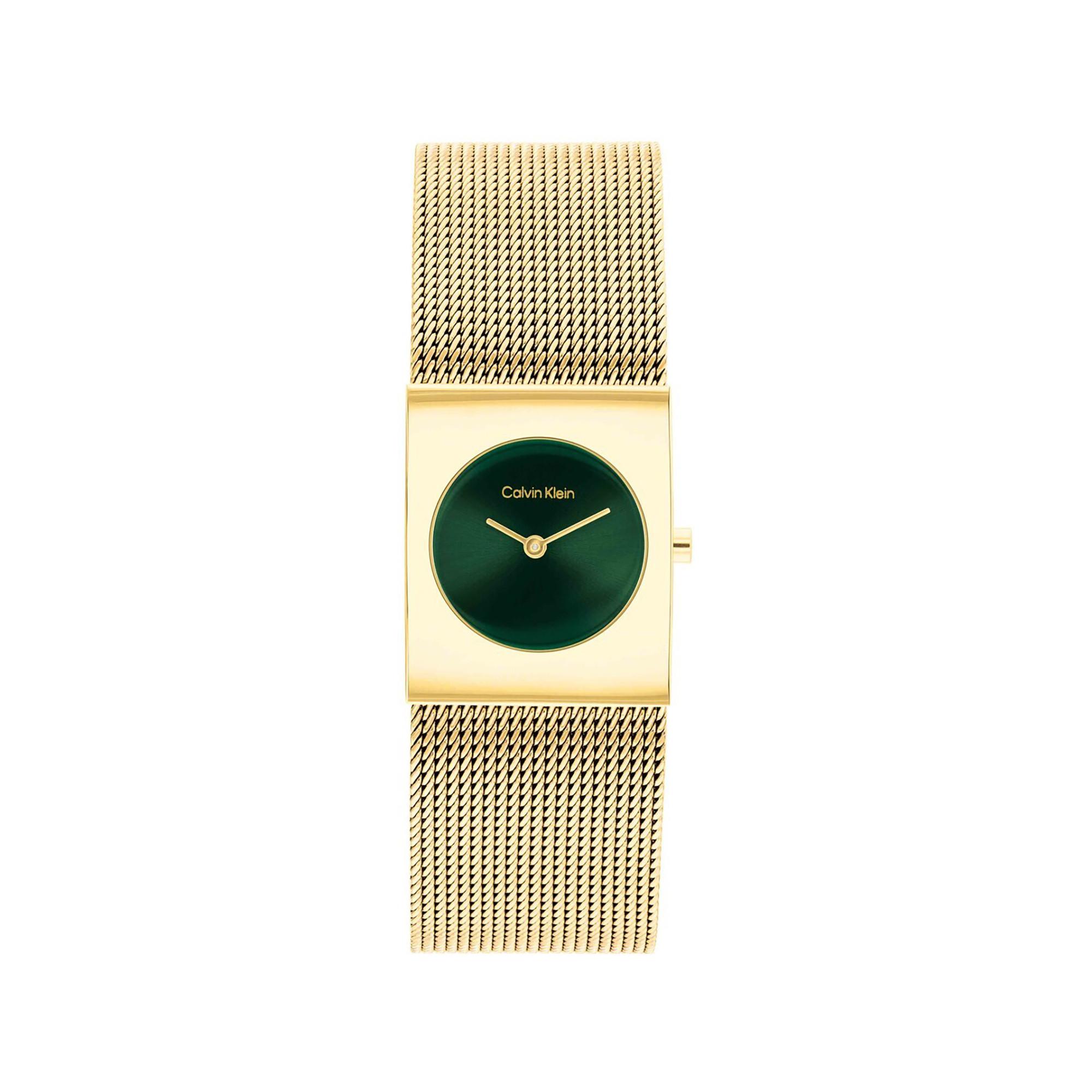 Die Calvin Klein CK Pulse Damenuhr beeindruckt mit ihrem eleganten, gelbgoldfarbenen edelstahlgehäuse mit pvd-beschichtung und eckiger form bei 21.5 mm durchmesser. Das gruene ziffernblatt mit analoger anzeige wird von kratzfestem mineralglas geschützt, waehrend das quarz-uhrwerk praezise zeitmessung garantiert.