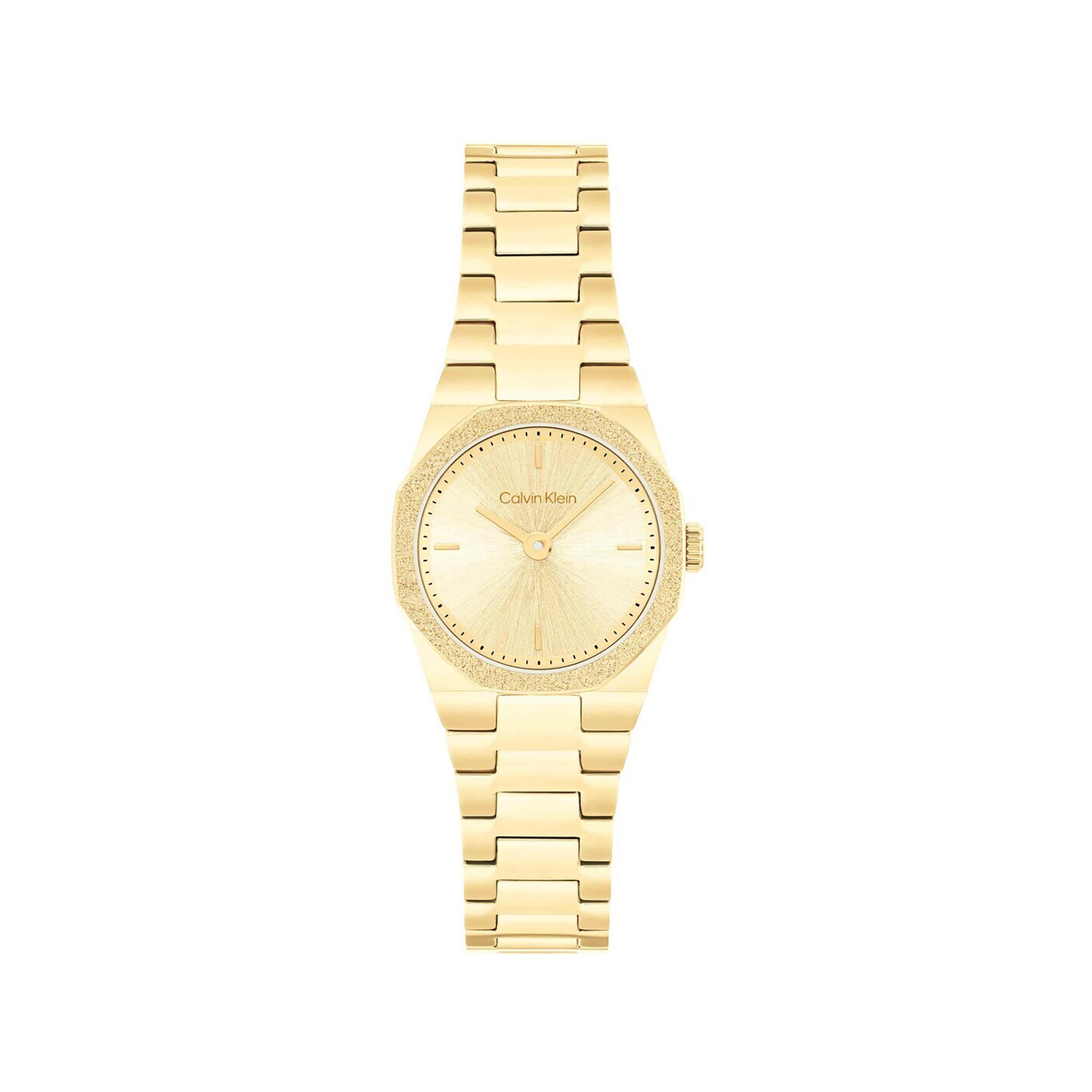 Die Calvin Klein Geometric Elegance Damenuhr beeindruckt mit elegantem, rundem edelstahl/pvd-gehäuse in gelbgold, 23 mm durchmesser und 6 mm hoehe. Das goldene ziffernblatt mit indizes, kratzfestes mineralglas und das gelbgoldfarbene edelstahl/pvd-armband mit faltverschluss bieten praezise zeitmessung und hohen tragekomfort.