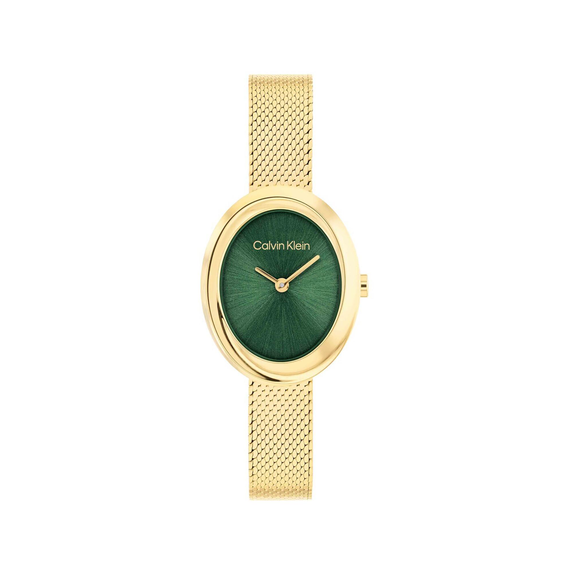 Die Calvin Klein Twisted Bezel Damenuhr besticht durch ihr elegantes, ovales edelstahl/pvd-gehäuse in gelbgold mit 24 mm durchmesser und 7.8 mm hoehe. Das gruene ziffernblatt mit analoger anzeige und das kratzfeste mineralglas sorgen fuer optimale sicht, waehrend das gelbgoldfarbene edelstahl/pvd-armband mit verstellbarem verschluss sicheren halt und hohen tragekomfort bietet.