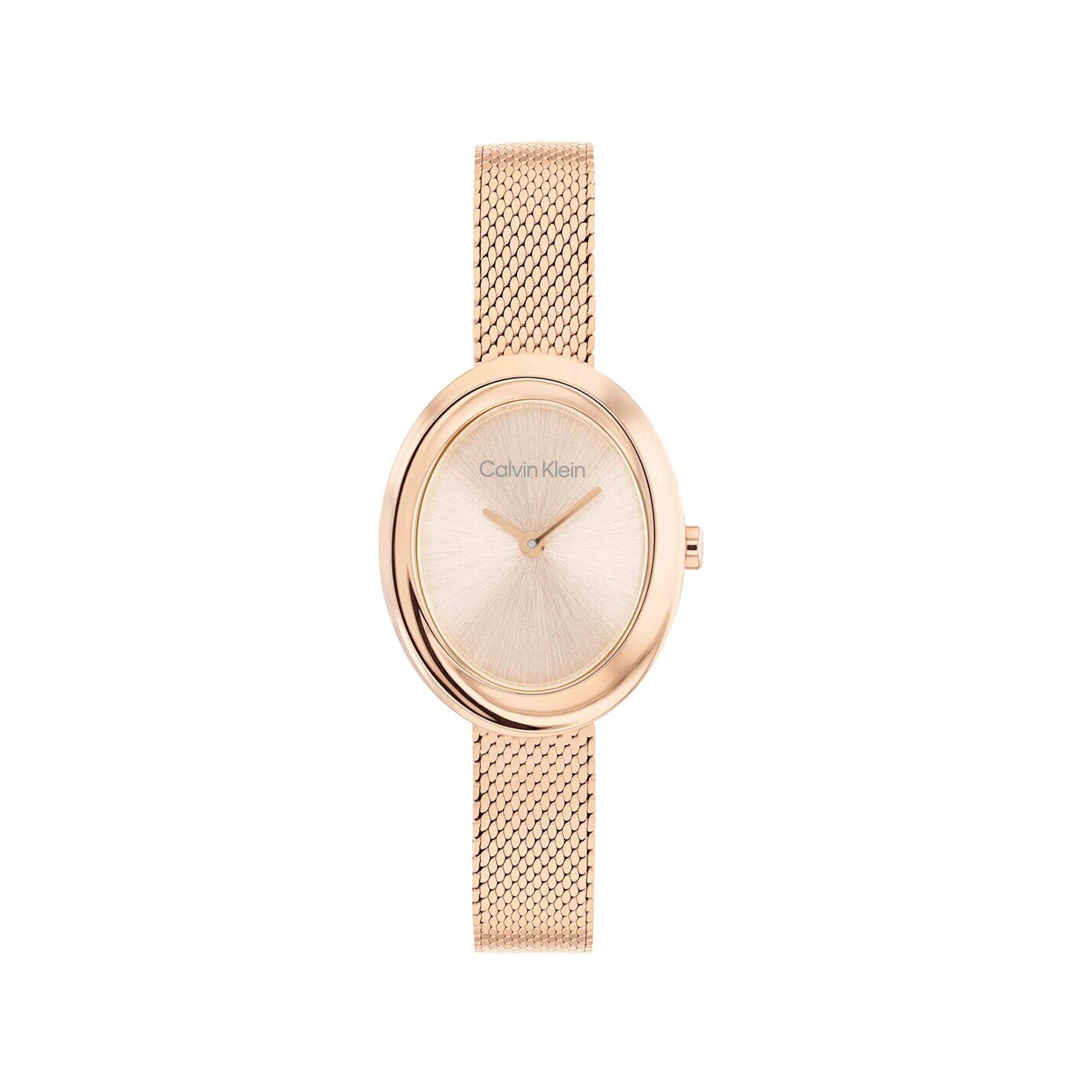 Die Calvin Klein Twisted Bezel Damenuhr besticht durch ihr elegantes, ovales edelstahl/pvd-gehäuse in roségold mit 24 mm durchmesser und 7.8 mm hoehe. Das roségoldfarbene ziffernblatt mit analoger anzeige und das kratzfeste mineralglas sorgen fuer optimale sicht, waehrend das roségoldfarbene edelstahl/pvd-armband mit verstellbarem verschluss sicheren halt und hohen tragekomfort bietet.