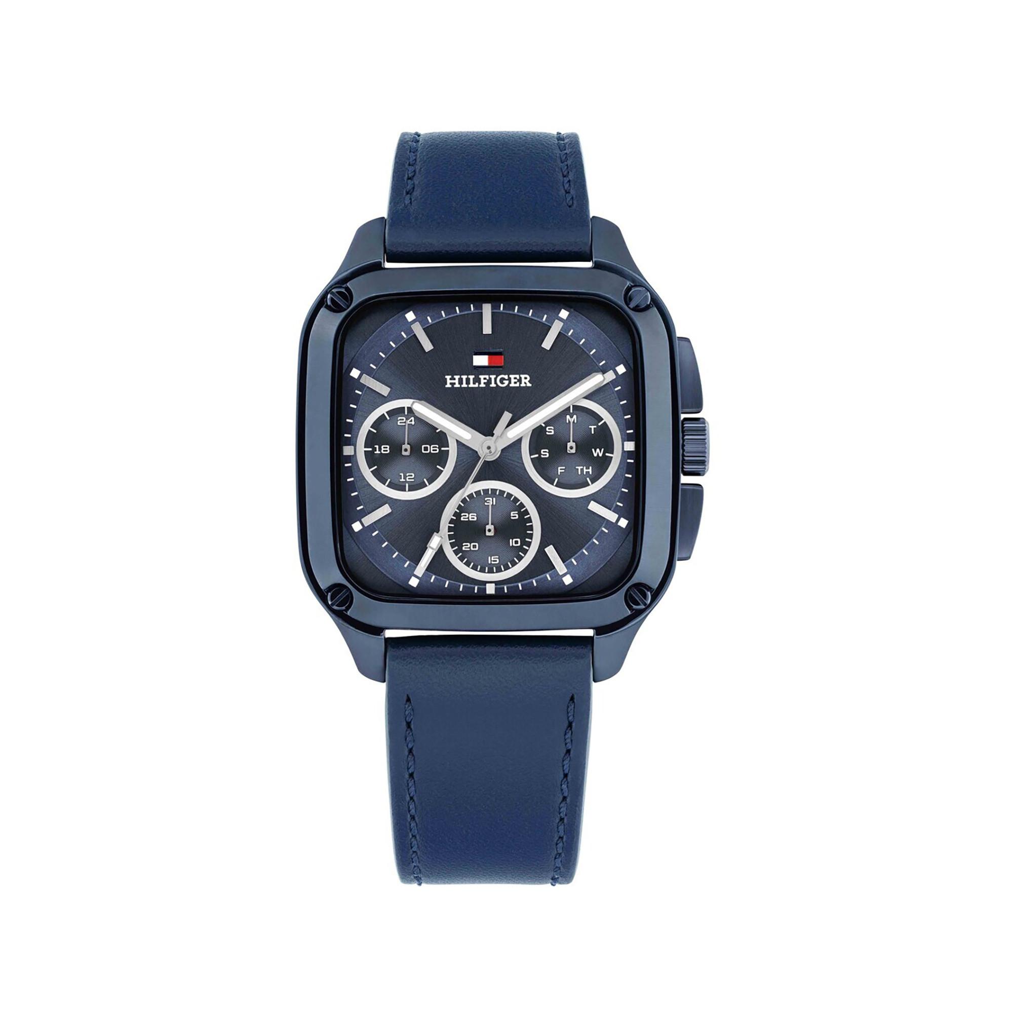 Entdecken Sie die Tommy Hilfiger Herald Herrenuhr 1792219 mit einem eleganten blauen Lederarmband. Das rechteckige Edelstahlgehäuse in Blau misst 39 mm im Durchmesser und unterstreicht das stilvolle Design. Angetrieben von einem präzisen Quarzwerk bietet die Uhr eine analoge Anzeige und ist bis 50 Meter wasserdicht. Das passende blaue Armband wird mit einer einfachen Schließe sicher am Handgelenk befestigt, während das Mineralglas das Zifferblatt vor Kratzern schützt. Ein einzigartiges Designdetail auf dem Zifferblatt macht diese Uhr unverwechselbar typisch für Tommy Hilfiger.