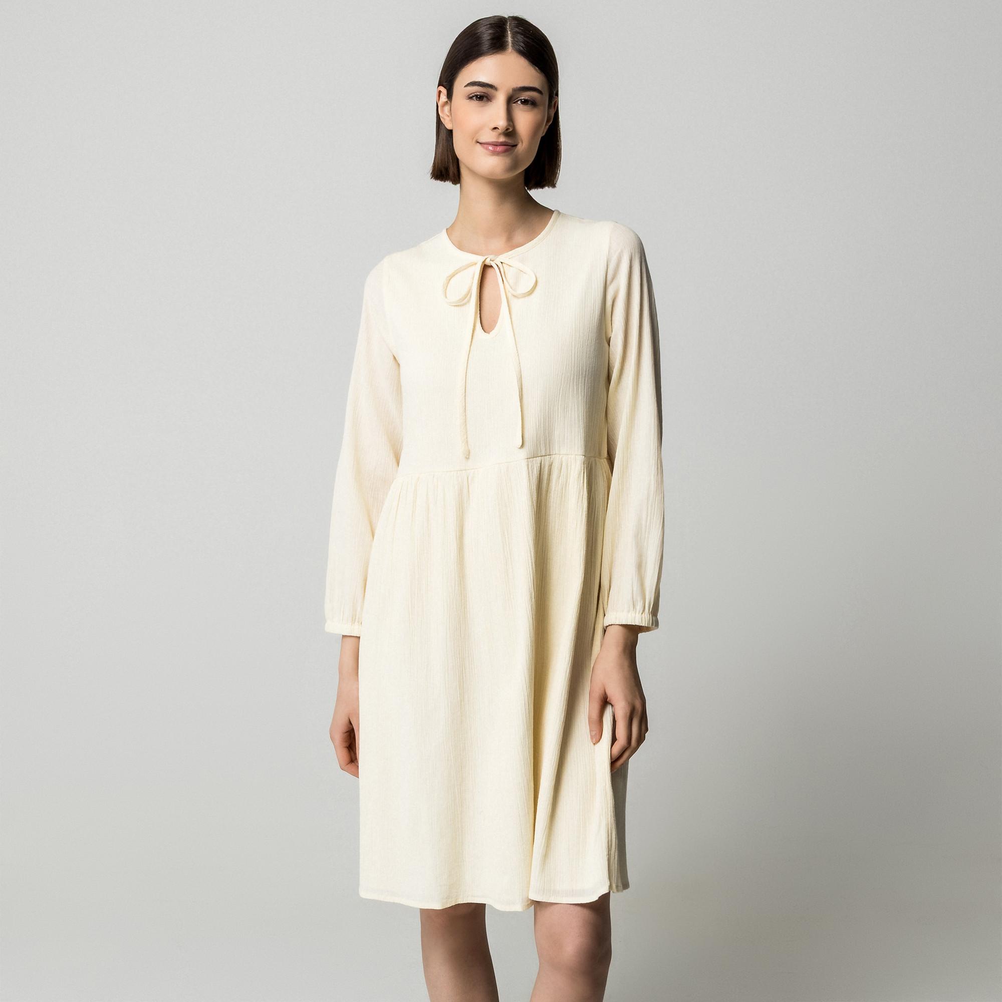 Dieses Freizeitkleid zeichnet sich durch eine entspannte Silhouette aus und ist somit eine bequeme Wahl für verschiedene Anlässe. Das Design umfasst einen Rundhalsausschnitt mit Schlüssellochausschnitt und Bindedetail, was dem Gesamtbild einen charmanten Touch verleiht. Die langen Ärmel sind mit elastischen Bündchen versehen, die für eine bequeme Passform sorgen.