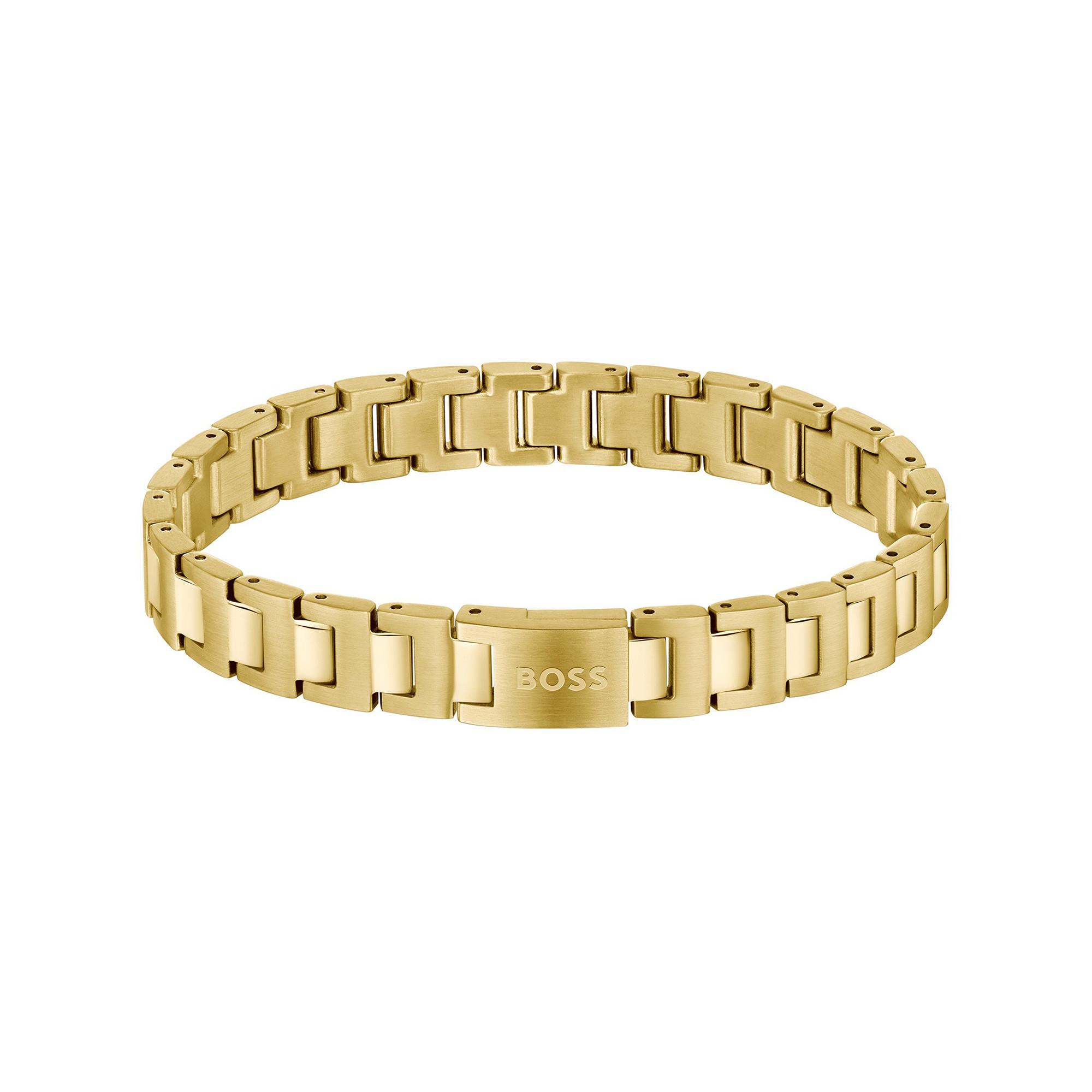 Das Boss Candor Armband für Herren aus goldplattiertem Edelstahl vereint modernen Stil mit langlebiger Qualität. Das klassische Gliederdesign verleiht jedem Look eine elegante Note und eignet sich perfekt als Geschenk.