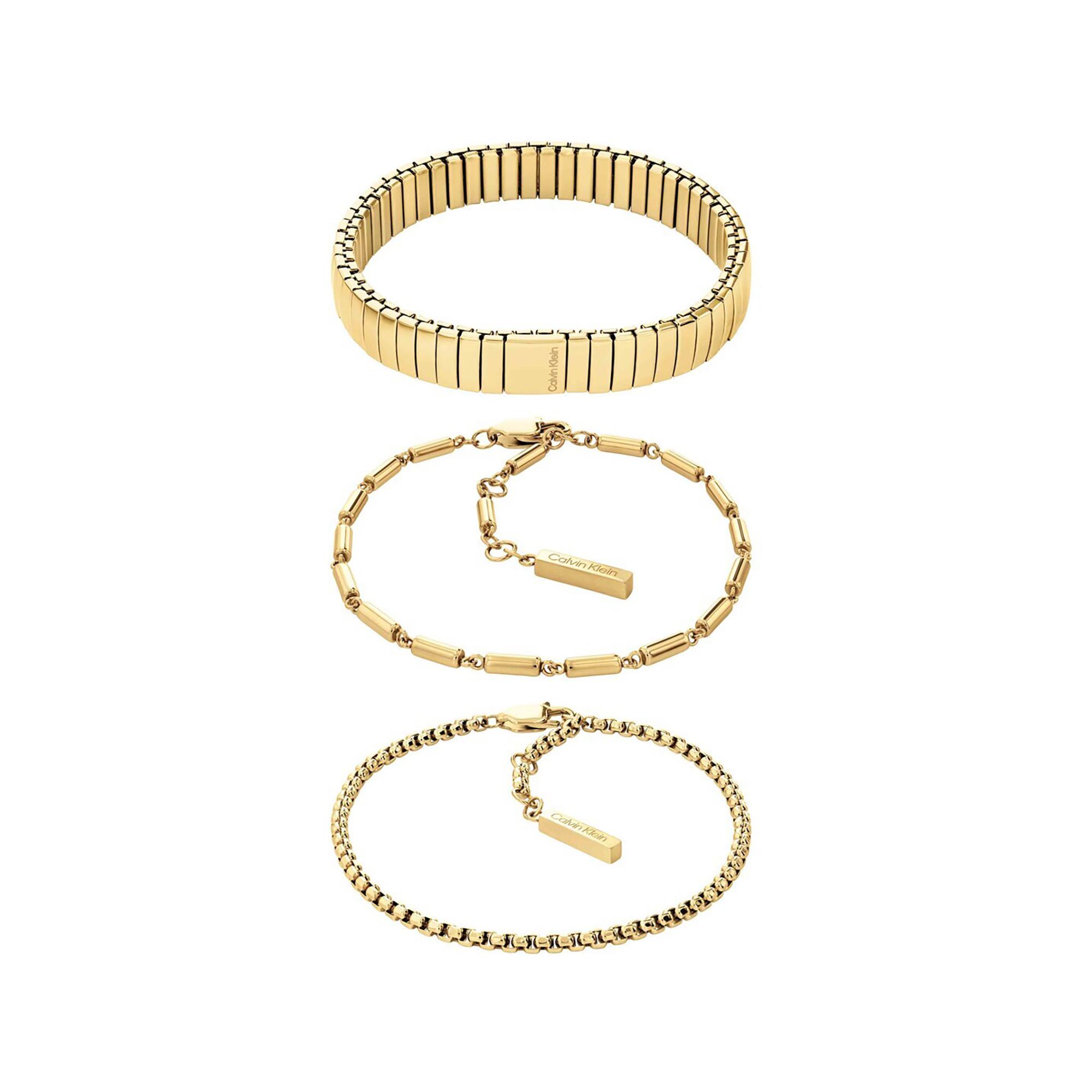 Das Calvin Klein ck stacked Armband-Set für Damen besteht aus drei gelbgoldfarbenen Armbändern aus hochwertigem Edelstahl mit PVD-Beschichtung. Das moderne Design und die robuste Verarbeitung machen das Set zu einem stilvollen und langlebigen Accessoire für jeden Anlass.
