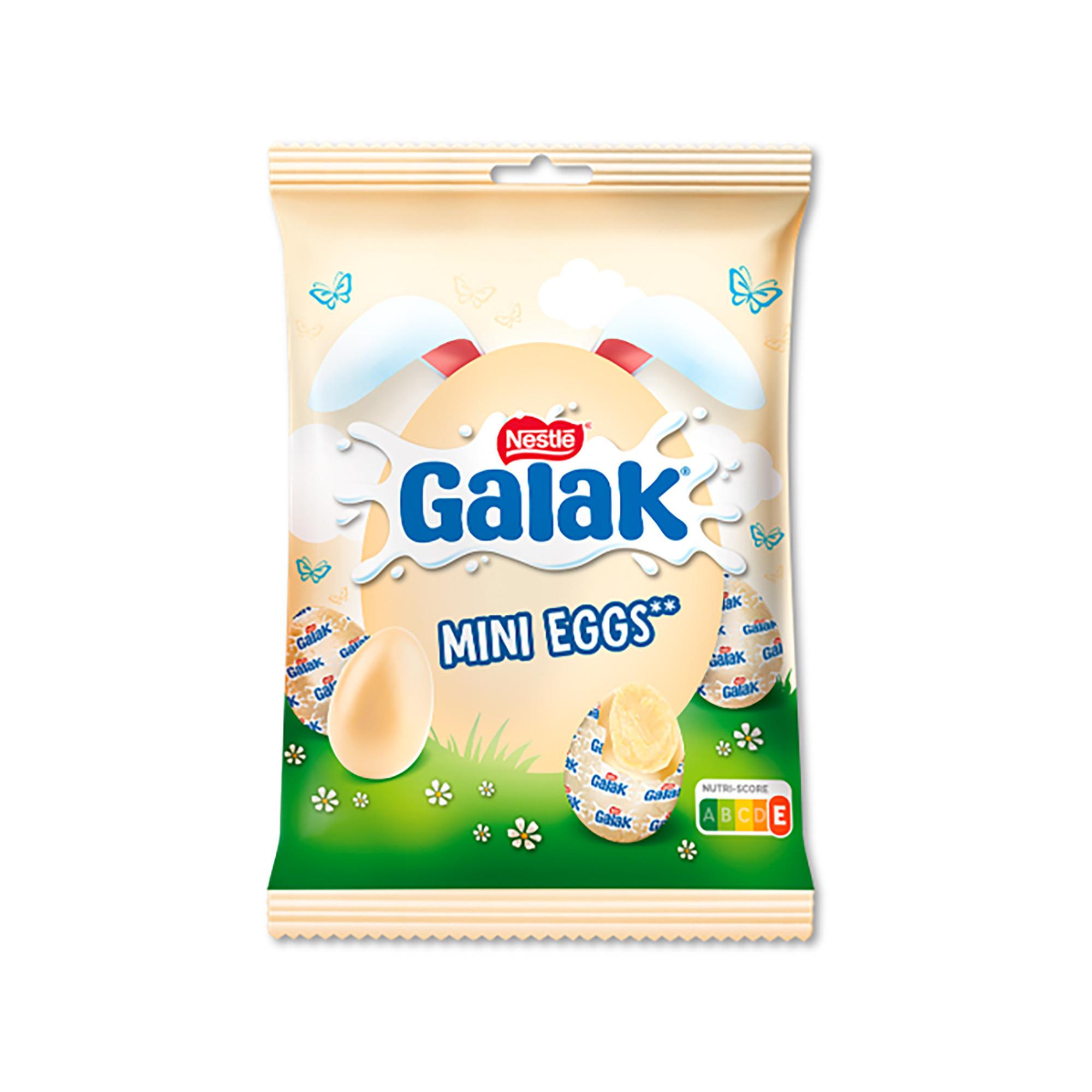 Feiern Sie Ostern mit den neuen GALAK-Mini-Eiern, umhüllt von köstlicher weisser Schokolade und gefüllt mit Milchschokolade. Dank ihrer idealen Grösse für Ostern werden sie Gross und Klein begeistern!