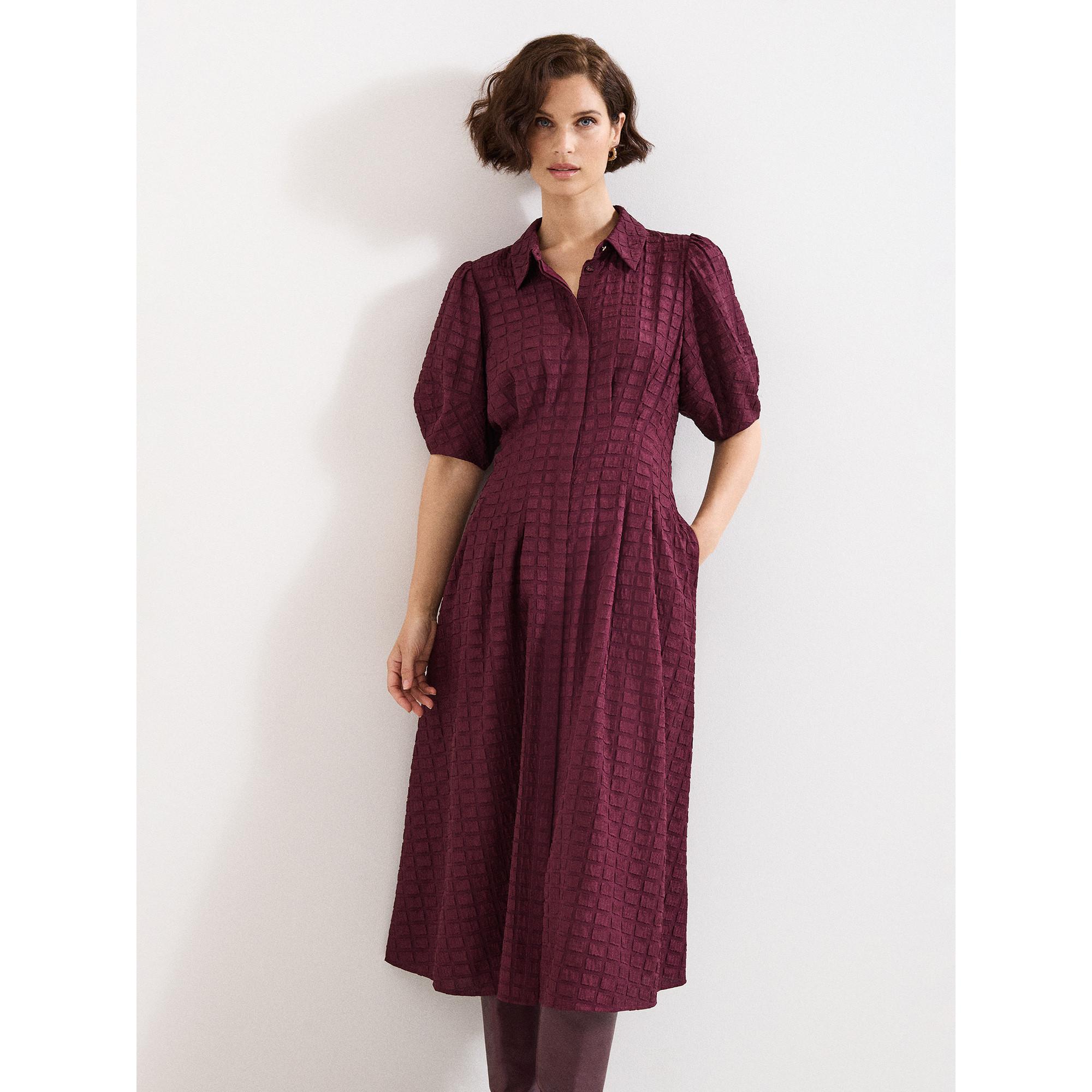 Das Midikleid von Phase Eight ist aus angenehm fliessendem Stoff gefertigt und zeigt sich mit zarten Falten am Oberteil. Puffärmel und eine Knopfleiste sorgen für Volumen und eine feminine Silhouette. Die bordeauxrote Farbe macht den Look ideal für elegante Herbst-Outfits.