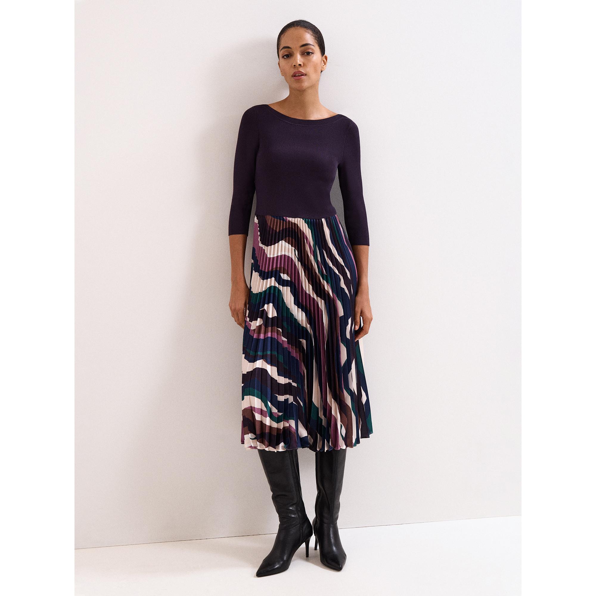Das Midikleid kombiniert ein gestricktes Oberteil mit U-Boot-Ausschnitt und 3/4-Ärmeln mit einem weich fallenden Faltenrock. Der abstrakte Print verleiht dem Design eine moderne Note. In dunklem Pflaumenton passt der Look perfekt zu eleganten Herbst-Outfits.