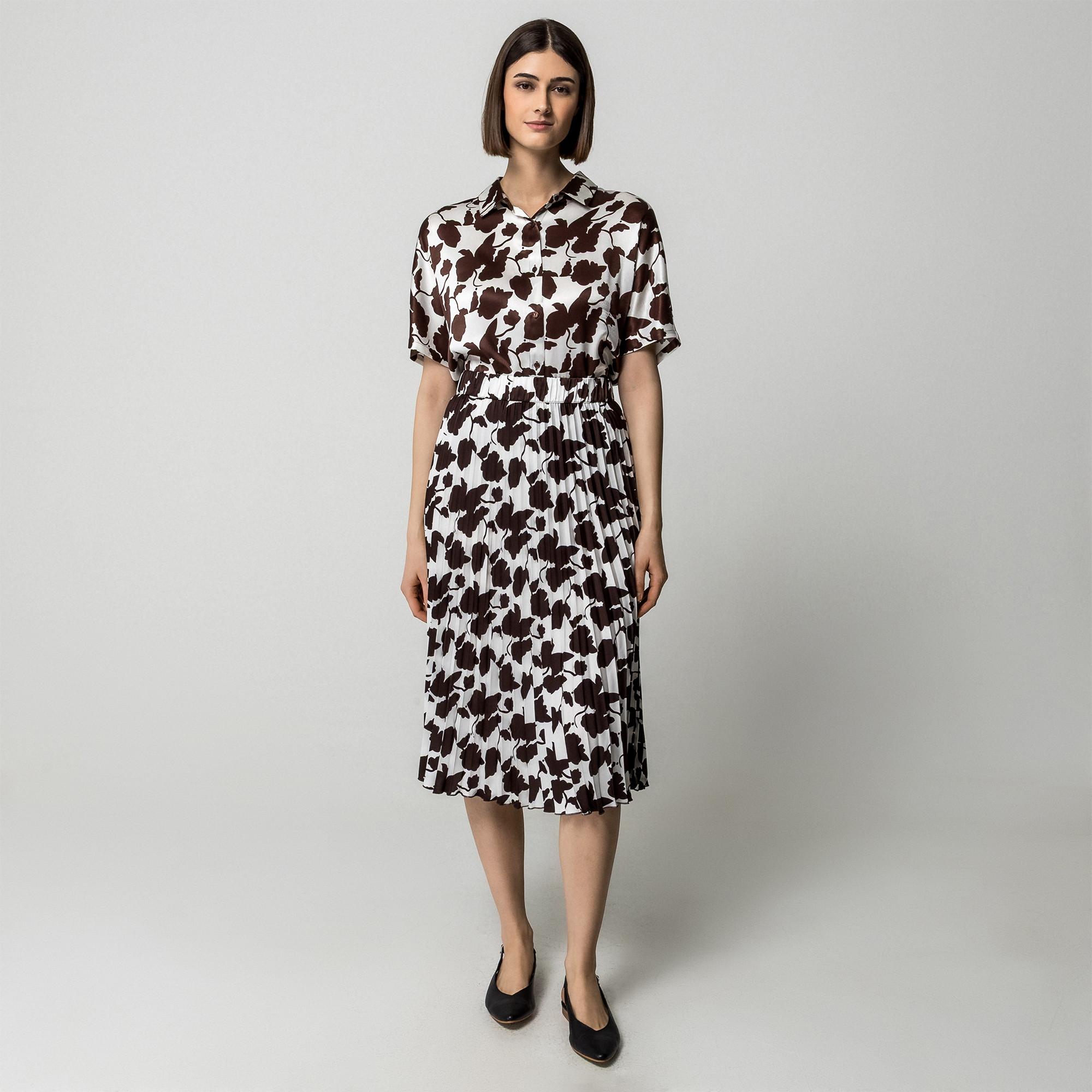 Diese Kurzarmbluse verfügt über einen klassischen Umlegekragen und eine durchgehende Knopfleiste, die eine zeitlose und vielseitige Ergänzung für jede Garderobe bietet. Das Design zeichnet sich durch ein markantes Blumenmuster aus, das einen stilvollen und eleganten Look verleiht.