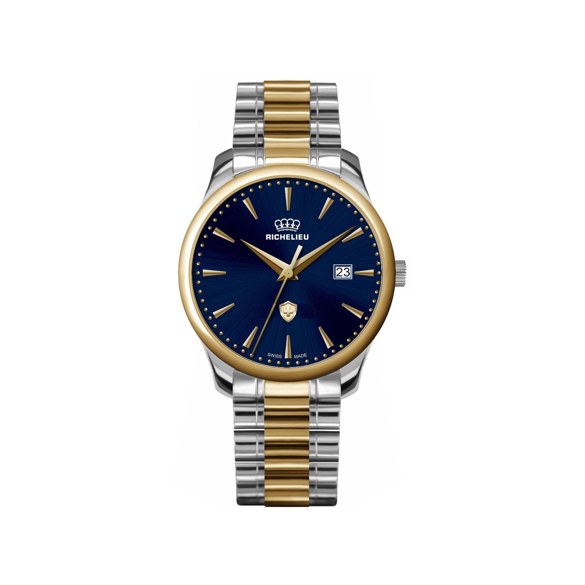 Die Analoguhr von Richelieu verbindet zeitlose Eleganz mit einem modernen Bicolor‑Design. Das tiefblaue Zifferblatt mit feiner Strahlenstruktur harmoniert stilvoll mit der goldfarbenen Lünette und den schlanken Indizes. Ein Datumsfenster auf der 3‑Uhr‑Position sorgt für praktische Alltagstauglichkeit. Das zweifarbige Metallarmband in Silber‑ und Goldoptik verleiht der Uhr eine souveräne, hochwertige Ausstrahlung.